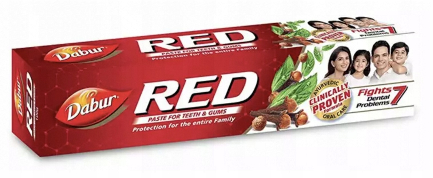 Паста Red Dabur ефективно усуває неприємний запах з рота, контролює бактерії ротової порожнини та благотворно впливає на ясна. Імбир, що міститься в пасті, має антисептичну дію, перець і м'ята освіжають подих, а гвоздика запобігає карієсу. Паста на 100% вегетаріанська.