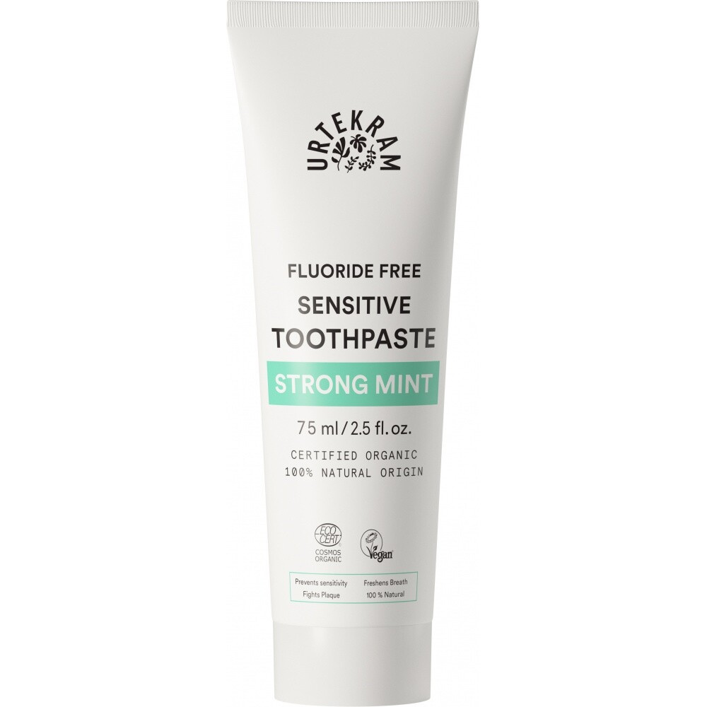 Зубна паста Urtekram Sensitive з сильним, освіжаючим смаком м'яти чудово очищає, захищає та доглядає навіть за надзвичайно чутливими зубами та яснами. Паста запобігає чутливості зубів, ефективно запобігає карієсу та зубному нальоту, зміцнює емаль, відновлює правильний мікробіологічний баланс і перешкоджає утворенню зубного каменю. Зубна паста не піниться.
