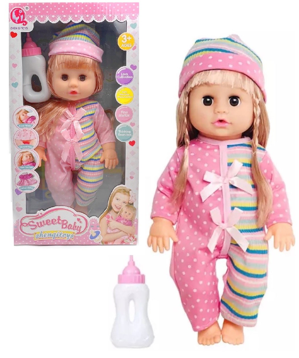 - 34 см заввишки лялька (у ляльки на животі гучномовець, сміється, плаче, розмовляє )