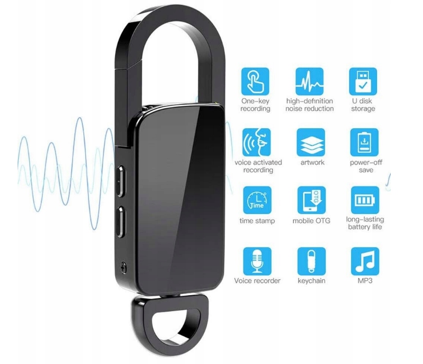 Міні-звукозаписувач із брелоком оснащений ефективним акумулятором, який забезпечує тривалий запис. Завдяки цьому вам не доведеться турбуватися про часту зарядку пристрою, що особливо важливо у разі тривалих зустрічей або конференцій. Вбудована пам’ять великого об’єму дозволяє зберігати години записів, що робить її ідеальним інструментом для тривалого аудіозапису.