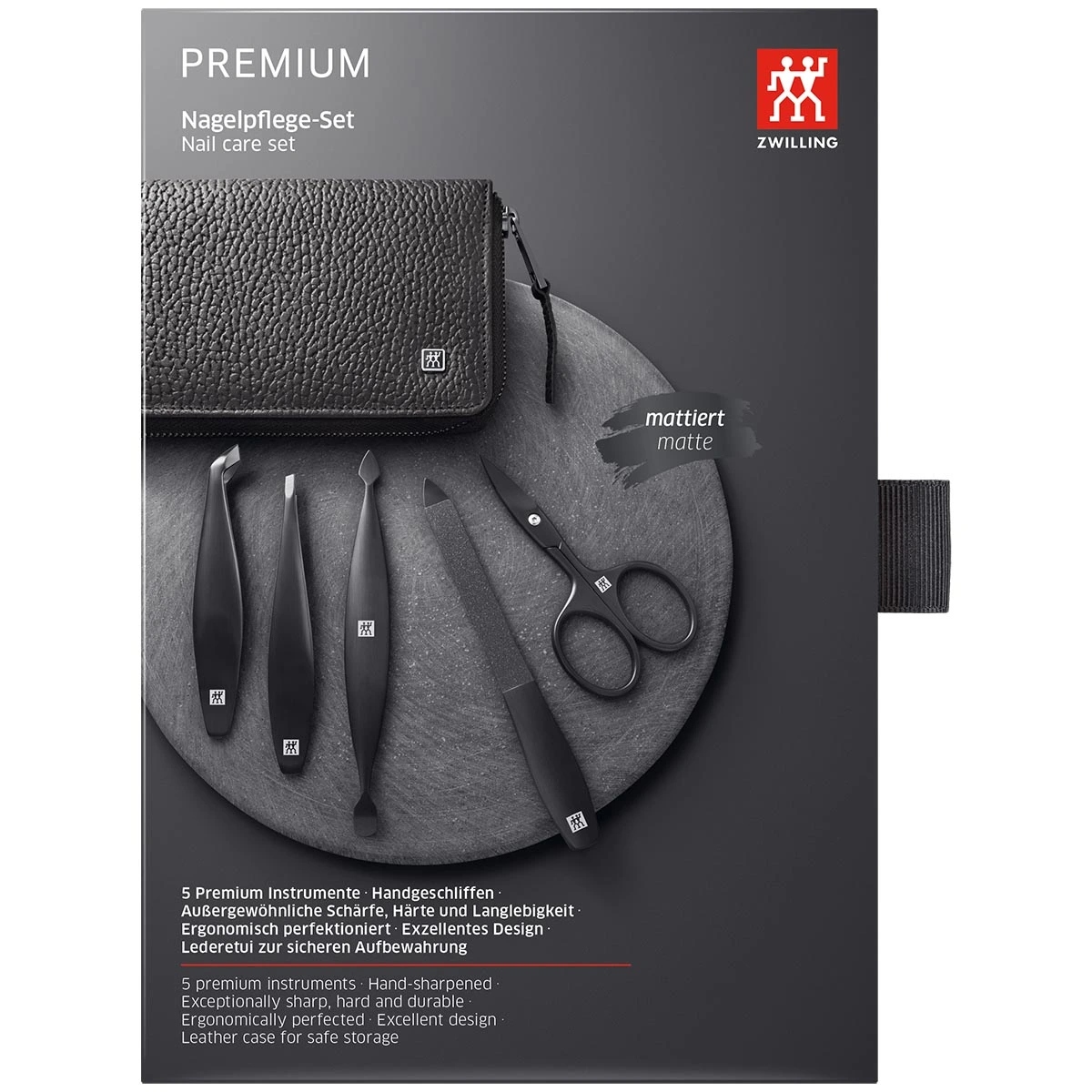 Розкішний чорний чоловічий шкіряний манікюрний набір ZWILLING преміум-класу з 5 предметів з інструментами з нержавіючої сталі з матовою чорною поверхнею.