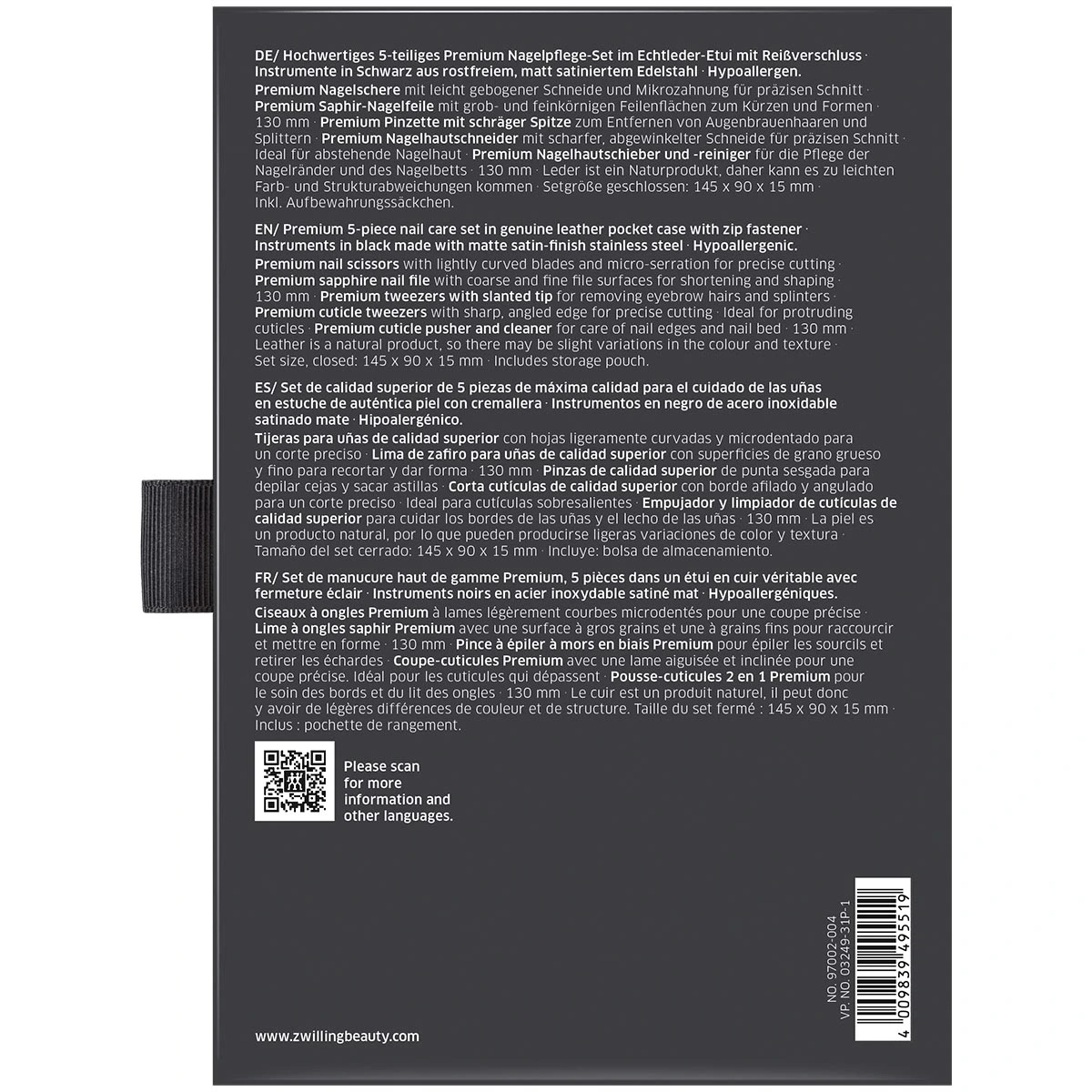 Елегантний Манікюрний набір із 5 предметів серії Premium Black від німецького бренду ZWILLING Beauty поєднує в собі найвищу якість, розкішний дизайн і практичність. Набір містить п'ять найбільш часто використовуваних інструментів для догляду за нігтями та кутикулою і ідеально підходить для щоденного використання. Компактний дизайн футляра дозволяє надійно зберігати манікюрні інструменти вдома та в дорозі.