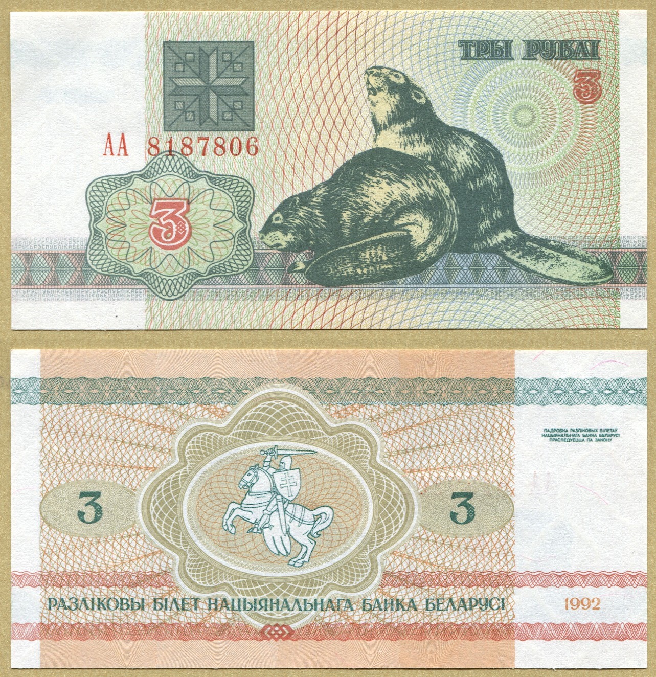 -- БЕЛАРУСЬ 3 РУБЛЯ 1992 AA P3a UNC Бобр