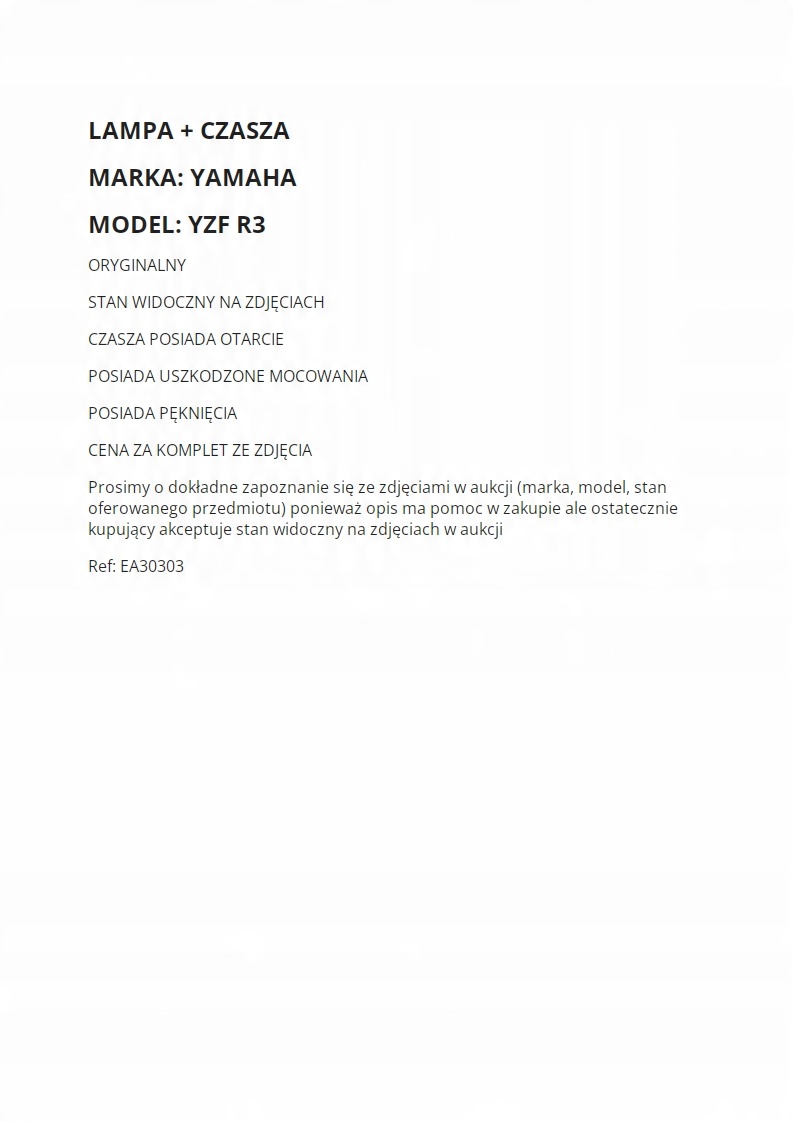 Просматривая «, Отражатель лампа, миска Yamaha YZF R3 CZ0», вы можете быть уверены, что данный товар из каталога «Фары» будет доставлен из Польши и проверен на целостность. В цене товара, указанной на сайте, учтена доставка из Польши. Внимание!!! Товары для Евросоюза, согласно законодательству стран Евросоюза, могут отличаться упаковкой или наполнением.