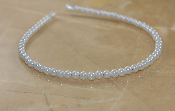 Металлические ленты с нанизанными на них белыми жемчужинами. На концах ободок продолговатая бусина жемчужного цвета.