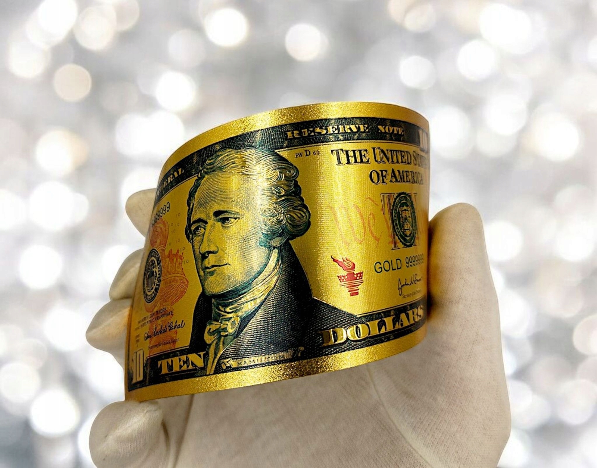 Красивая верная копия американской банкноты, сделанной из ПВХ и покрытой золотой фольгой с изображением Александр Гамильтон. Циркуляция. рукав