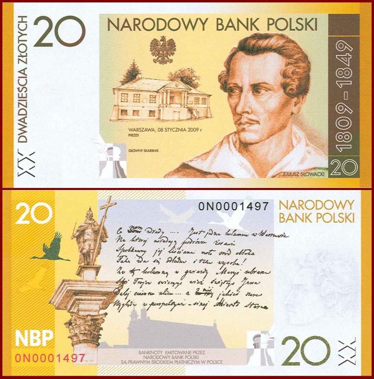 ~ Pln 20 2009 банкнот 200 -летний день рождения Юлиус Словацки Новый в деле UNC