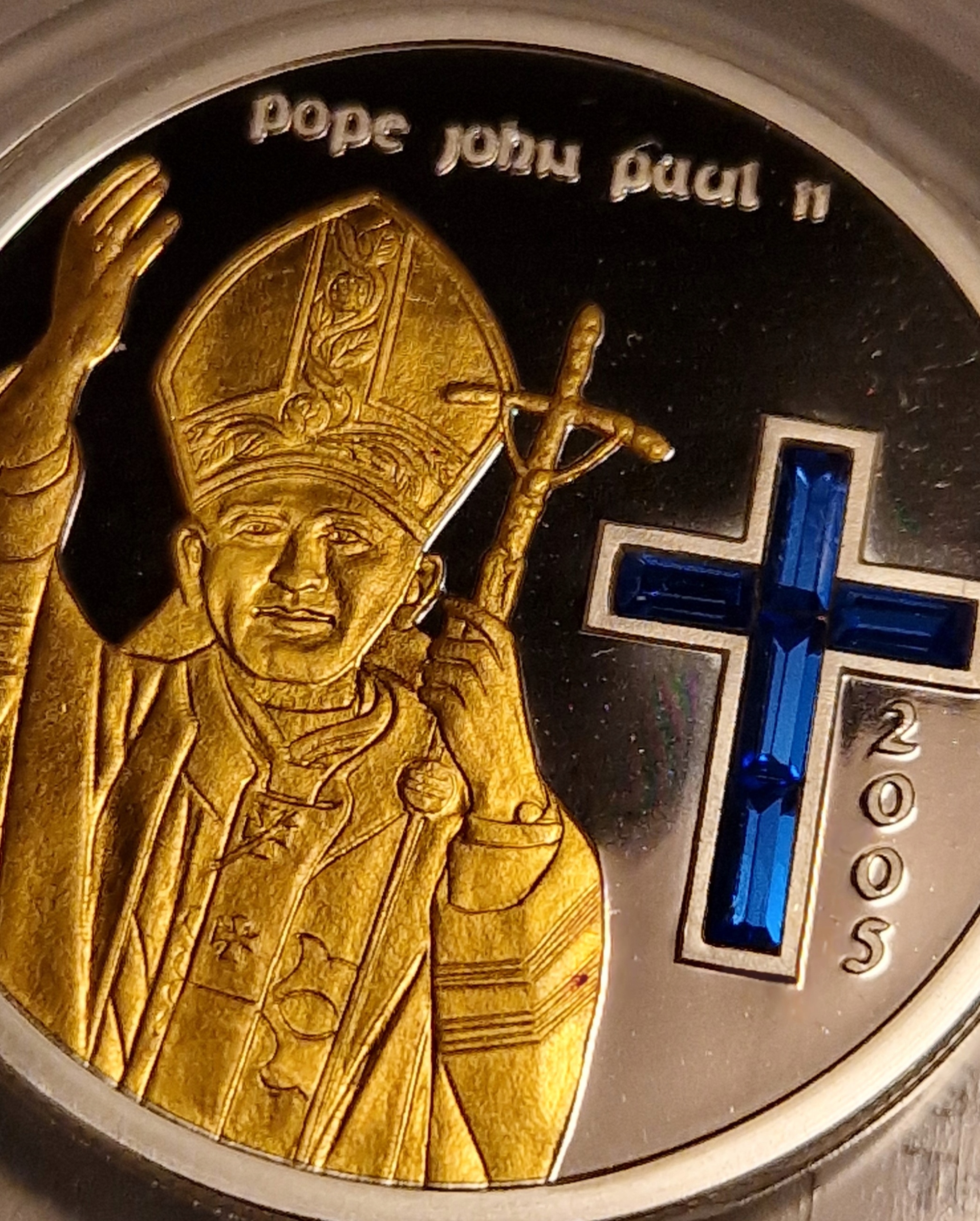 Предметом продажи является одна из серебряных монет из серии, посвященной деятелям и событиям Католической церкви, выпускаемой с 2004 года. Прекрасная серия, отчеканенная из серебра и золота, украшенная настоящими кристаллами Сваровски уникальной формы. Монета, представленная на фотографиях, находится в специальном оригинальном колпачке, из которого она ни разу не снималась, вместе с сертификатом.