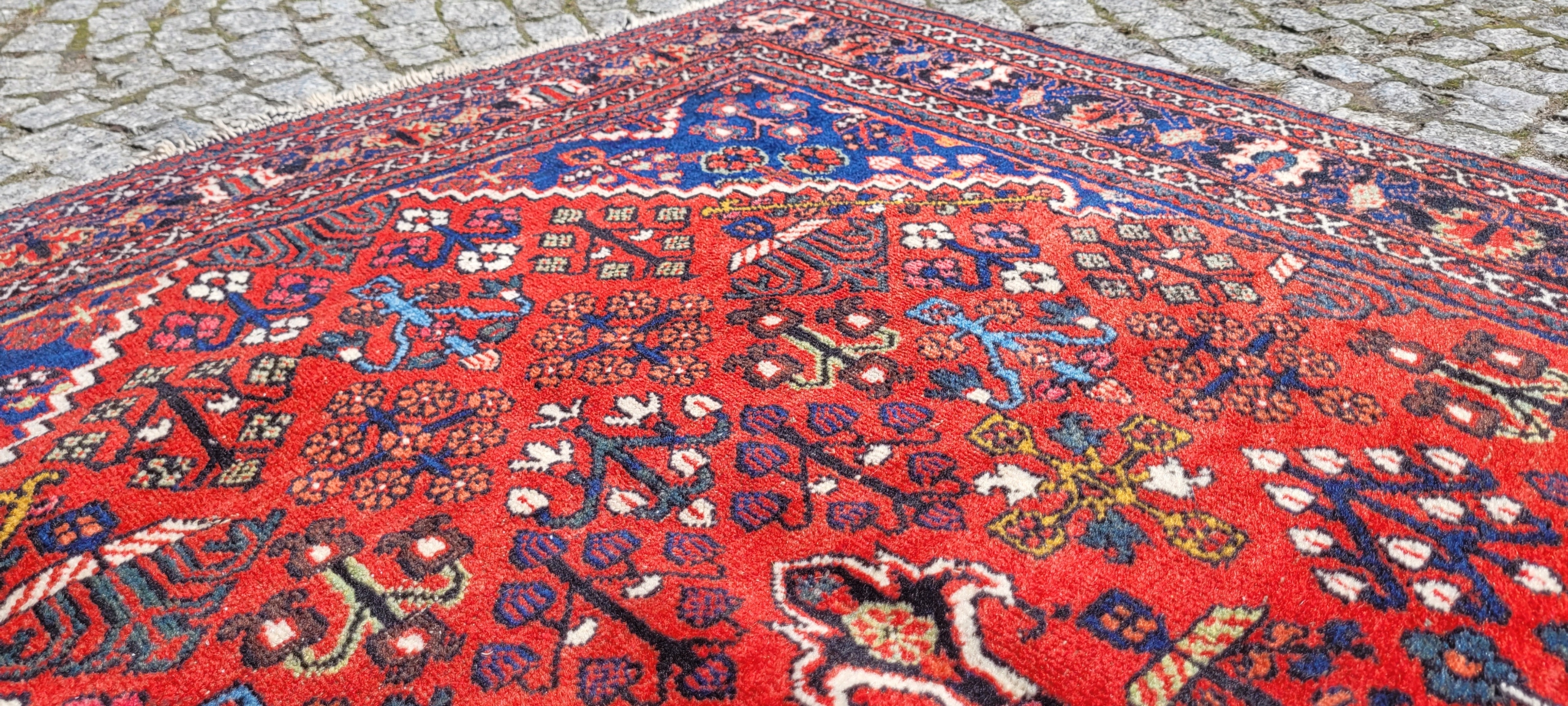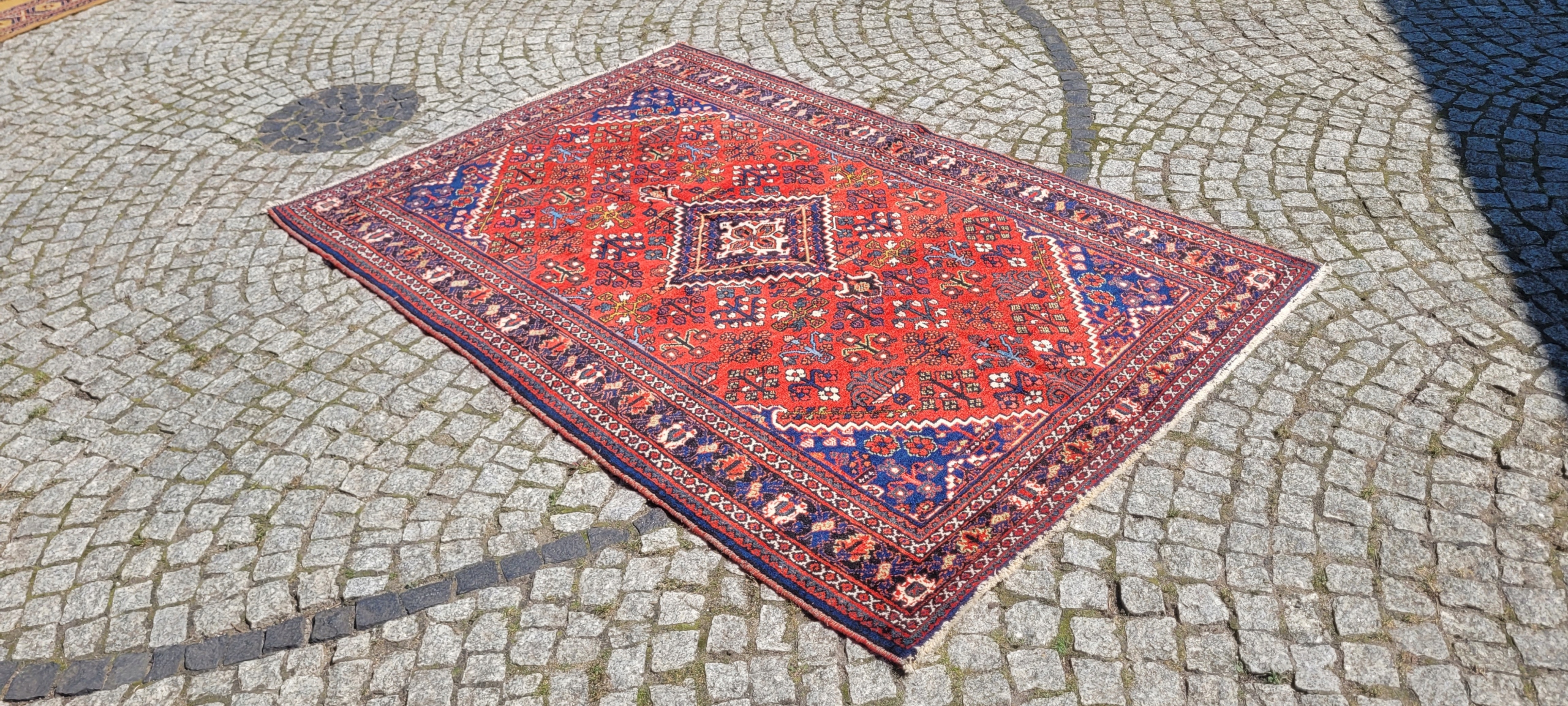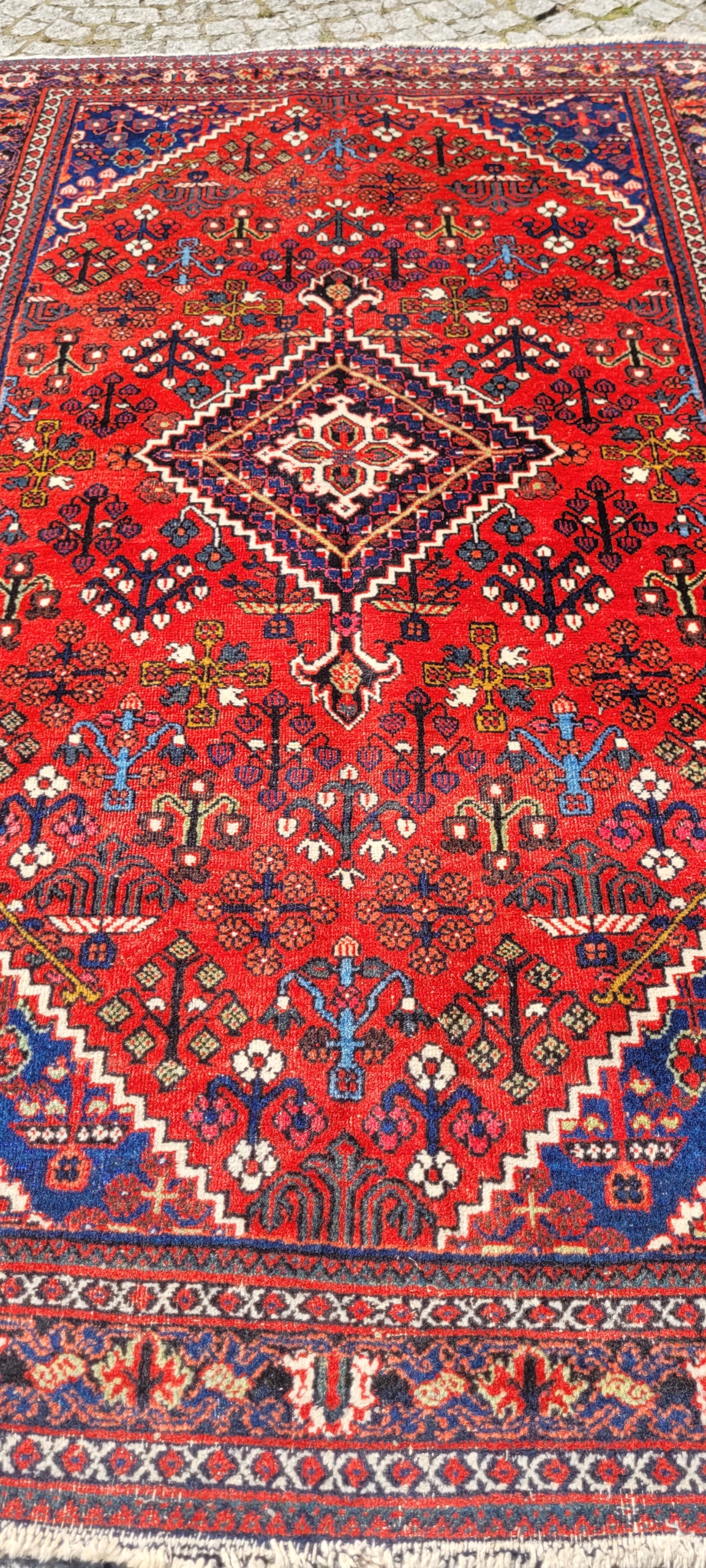 Старый персидский ковер Джушеган. Сплетено вручную из шерсти высочайшего качества. Для него характерен компактный, приятный на ощупь, блестящий флис, красивые цвета и узоры. Состояние очень хорошее, видно на фотографиях.
