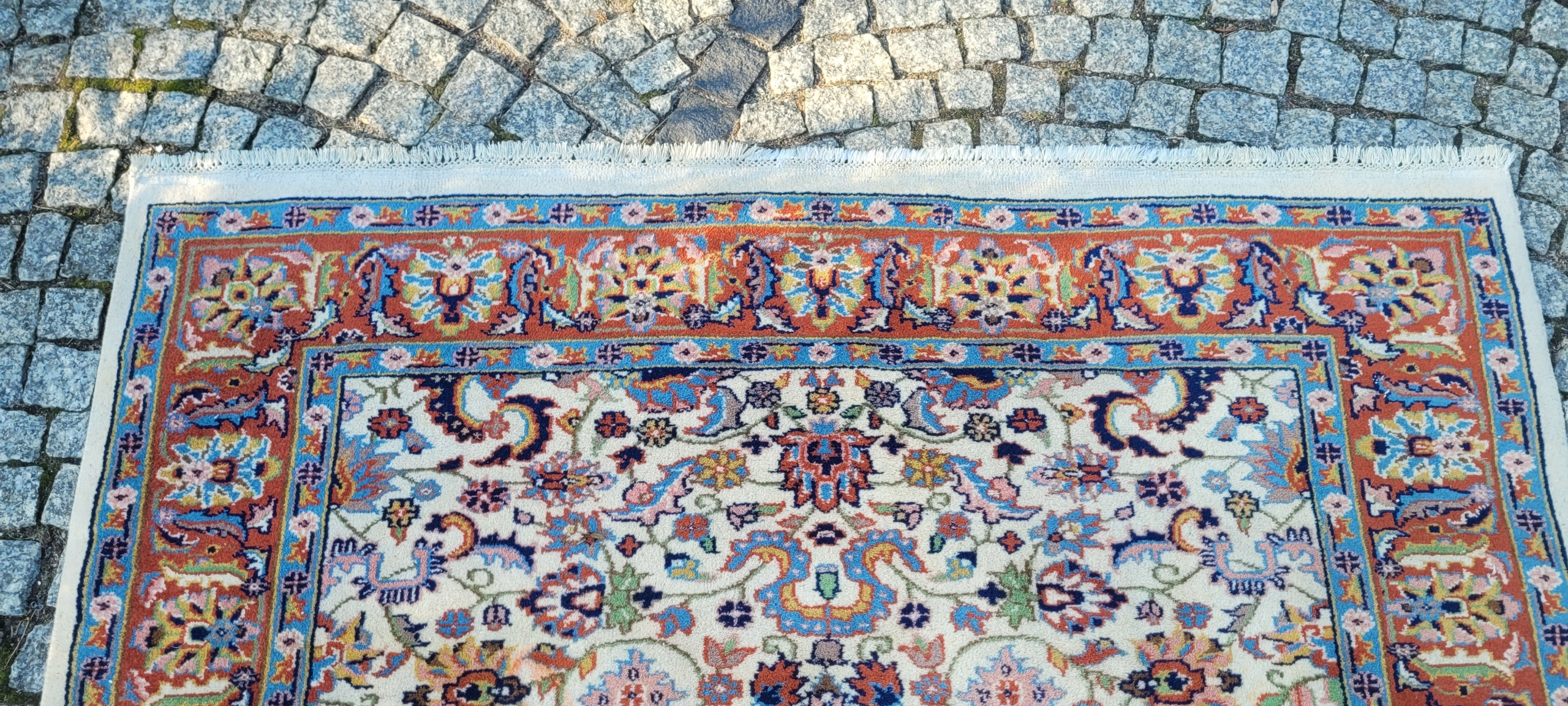 Красивый индийский ковер Тебриз. Сплетен вручную из шерсти. Для него характерен компактный, носимый флис, красивые цвета и узоры. Состояние видно на фотографиях.