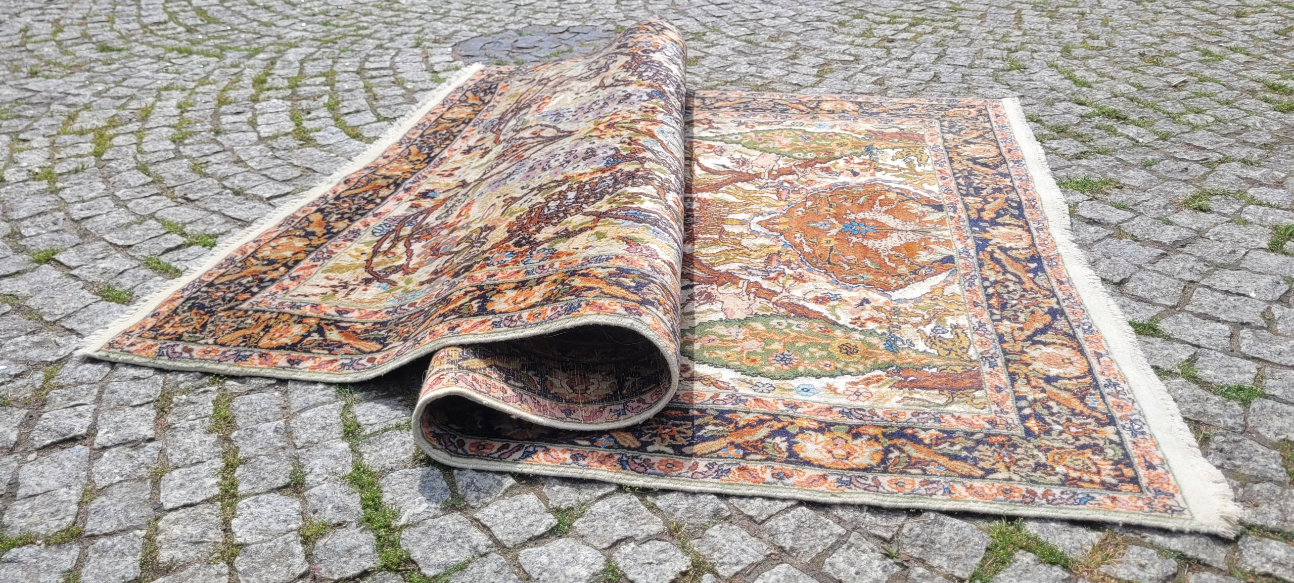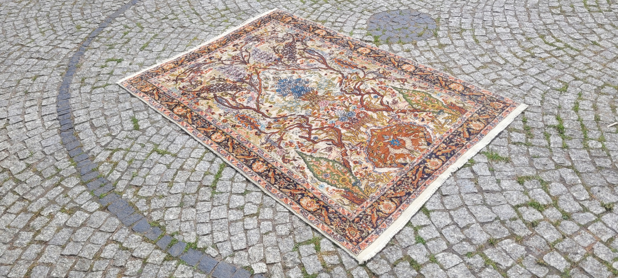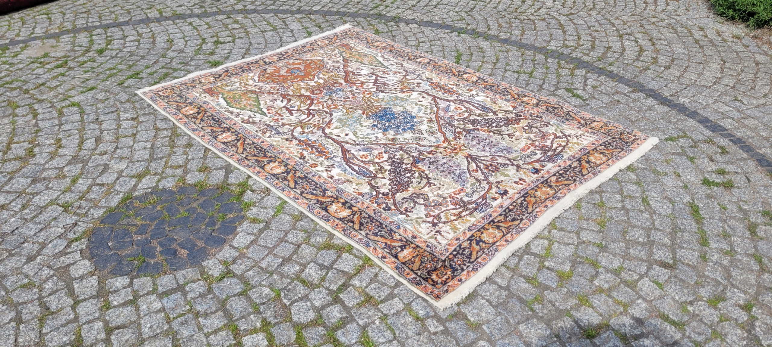 Ковер гом. Сплетено вручную из шерсти и шелка. Для него характерен компактный, приятный на ощупь, блестящий флис, красивые цвета и узоры. Состояние хорошее, видно на фотографиях.