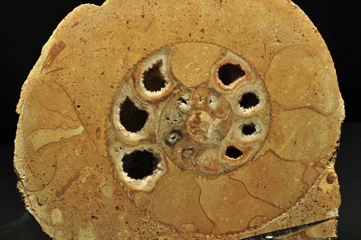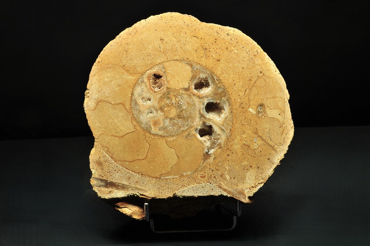 Аммониты, аммониты (Ammonoidea) — подкласс вымерших головоногих моллюсков (Cephalopoda), обычно с симметричной плоскоспиральной раковиной. Некоторые типы имели необычную форму, например. прямая оболочка, вертикально закрученная спираль или спираль с бесконтактными витками. Они встречаются в породах морского происхождения, датируемых от девона до конца мела. Некоторые отдельные камеры открыты и заполнены богатым набором бежево-серых и коричневых кристаллов кальцита, с перегородками между каждой камерой.