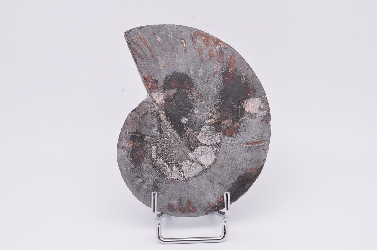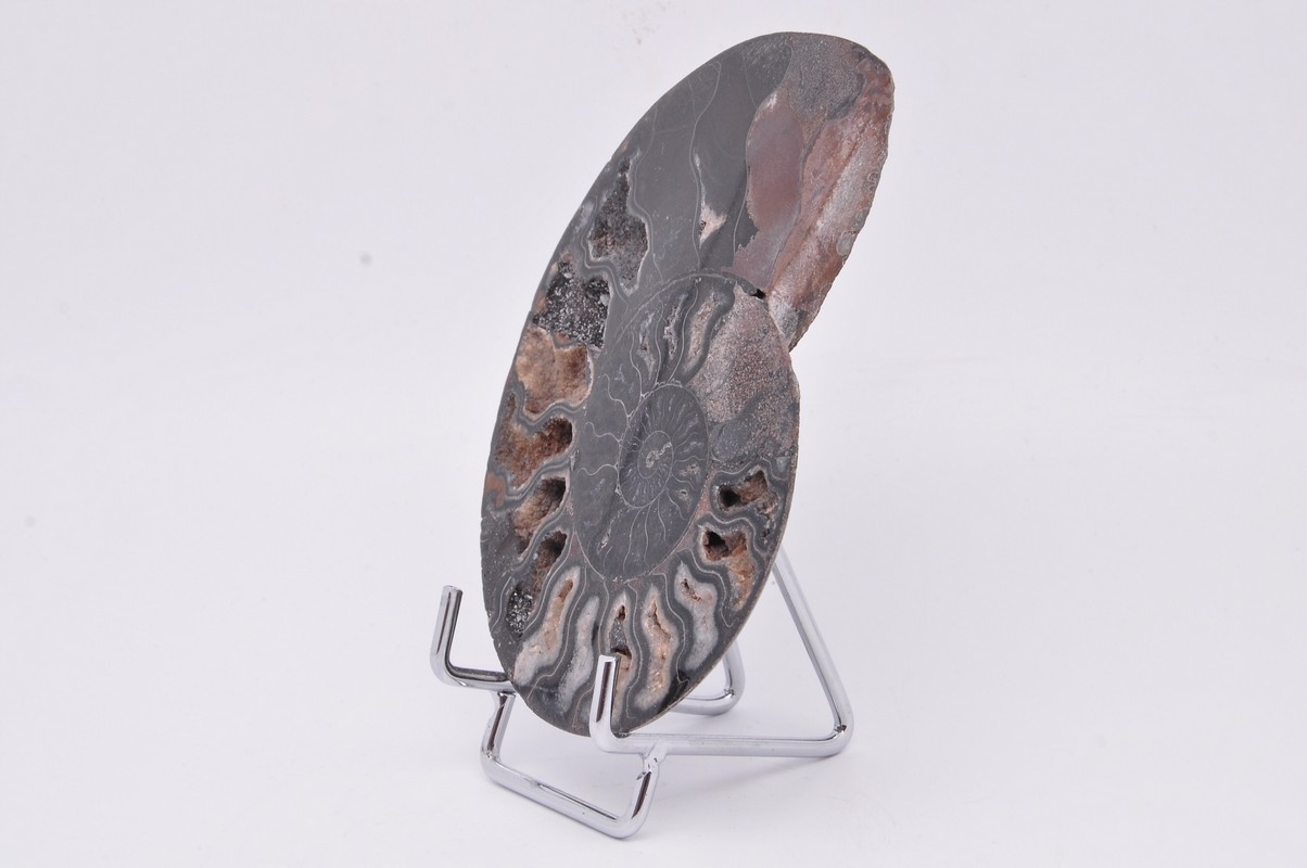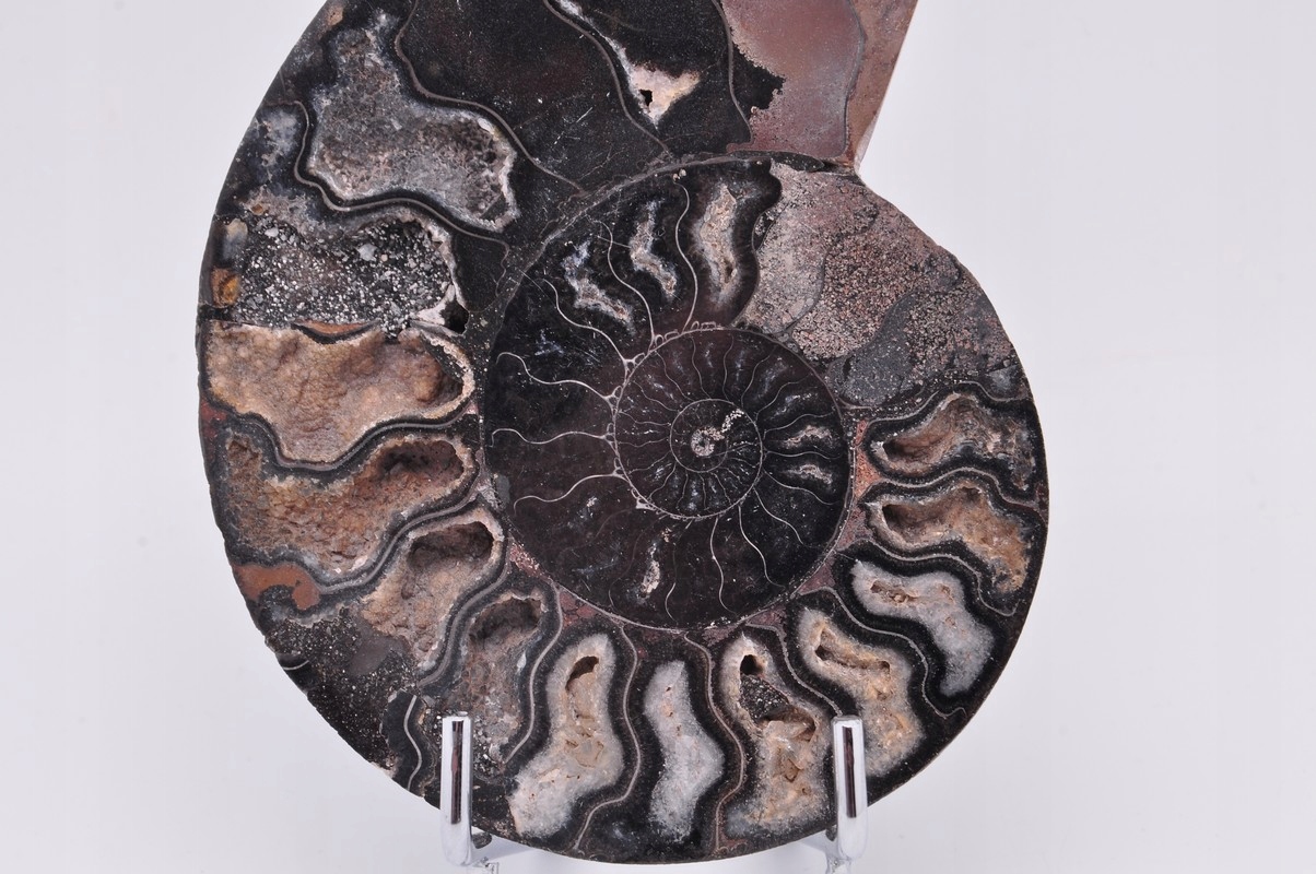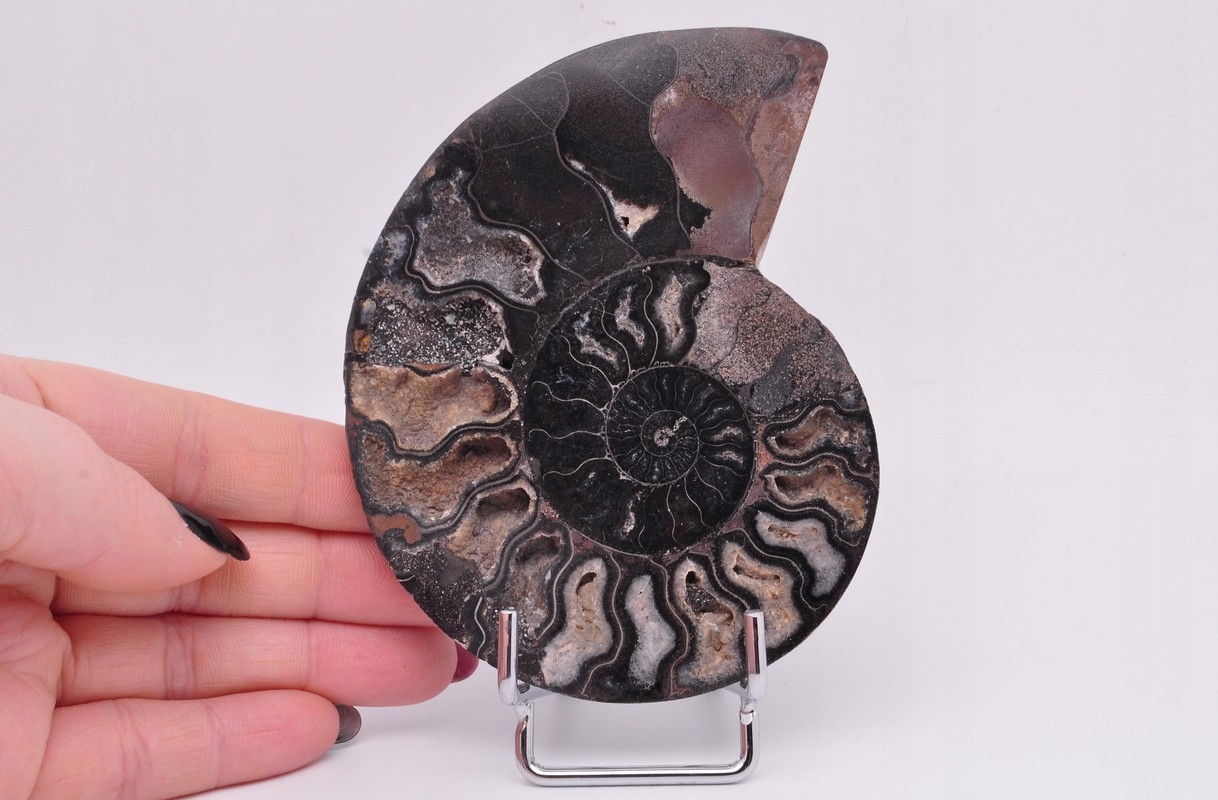 ПОЛОВИНА ЧЕРНОГО АММОНИТА, ПРЕКРАСНО СОХРАНЕННЫЙ ОБРАЗЕЦ. ЭТО ИСКОПАЕМОЕ ИЗ МАДАГАСКАРА, ДАВИРОВАННОЕ ПЕРИОДОМ КРЕТАГО. УНИКАЛЬНЫЙ ОБРАЗЕЦ, ВЫРЕЗАННЫЙ И ПОЛИРОВАННЫЙ С ОДНОЙ СТОРОНЫ. ОЧЕНЬ РЕДКИЙ ЧЕРНЫЙ ОБРАЗЕЦ.