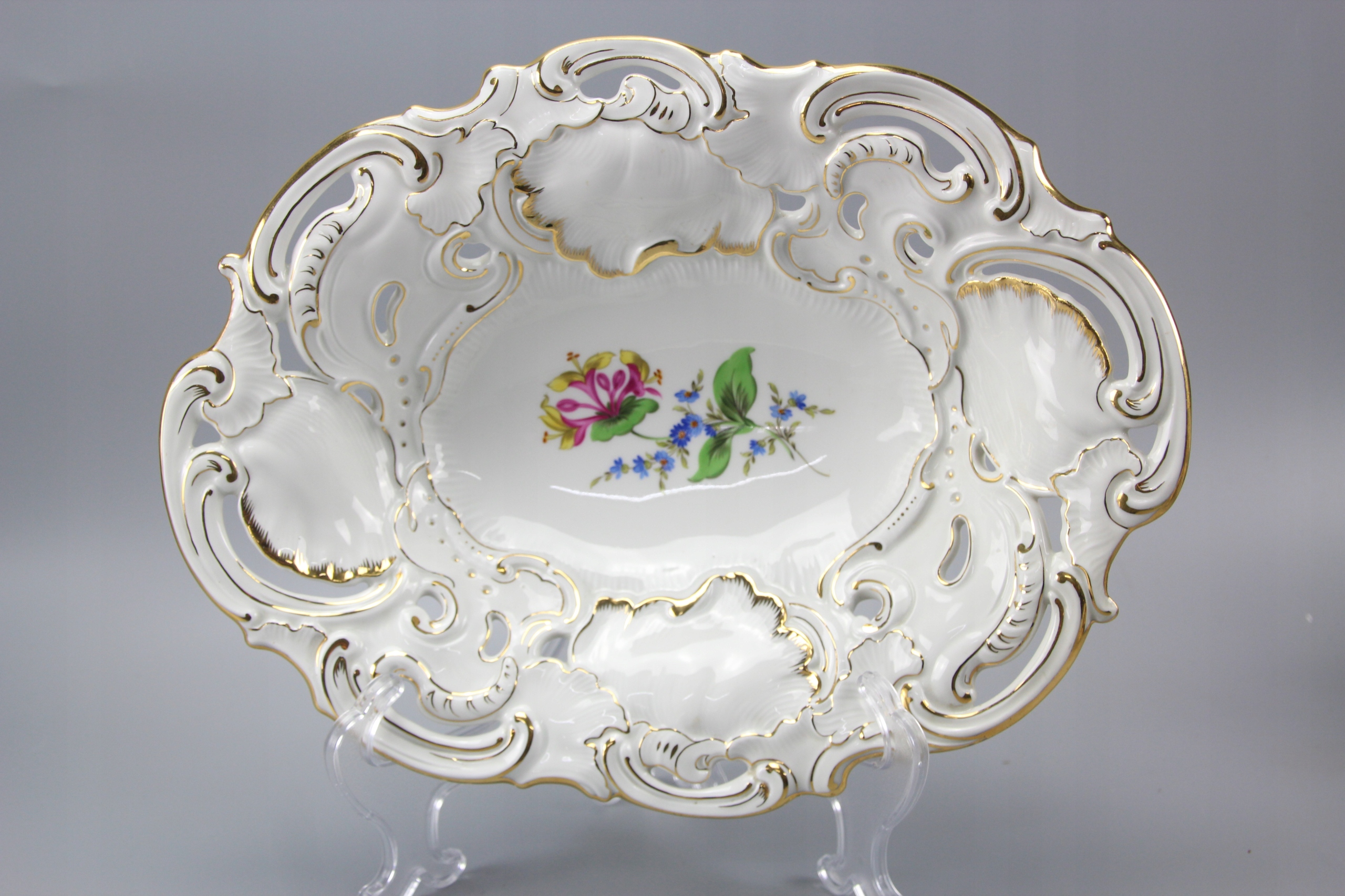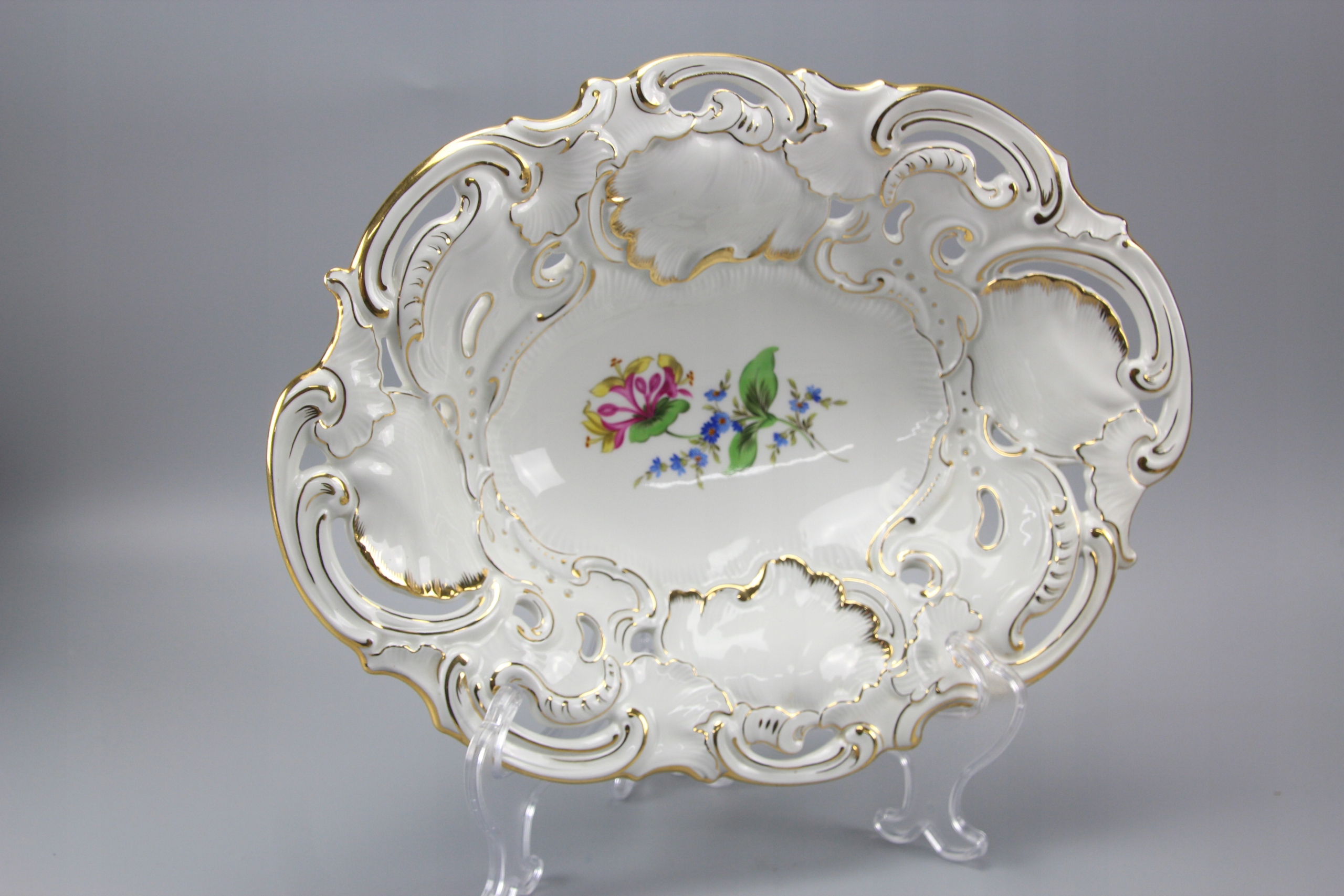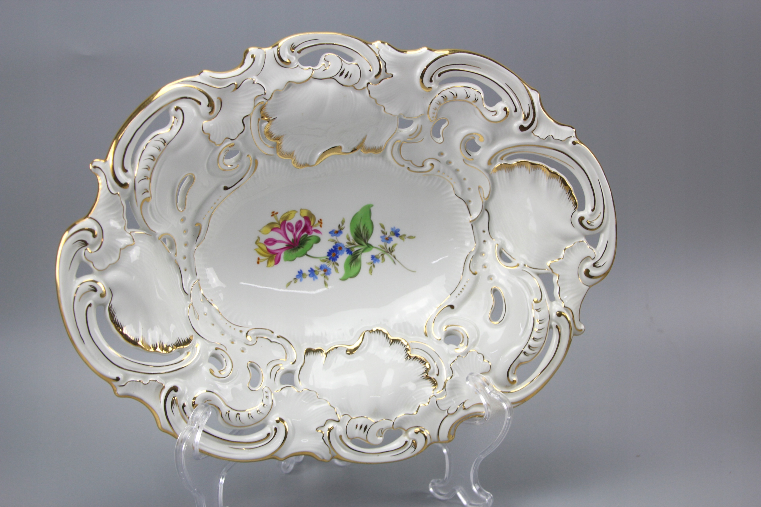 Тарелка овальная с ажурным воротником, украшенная цветочным мотивом;