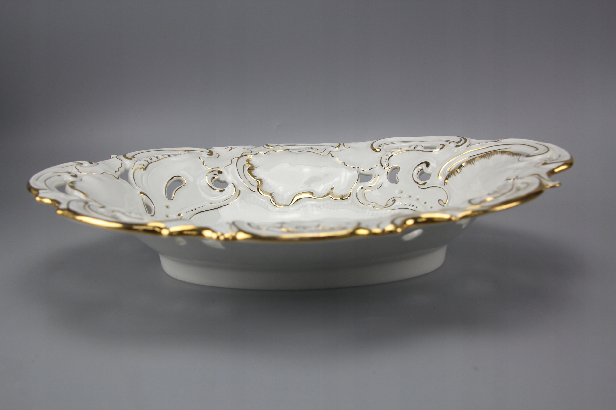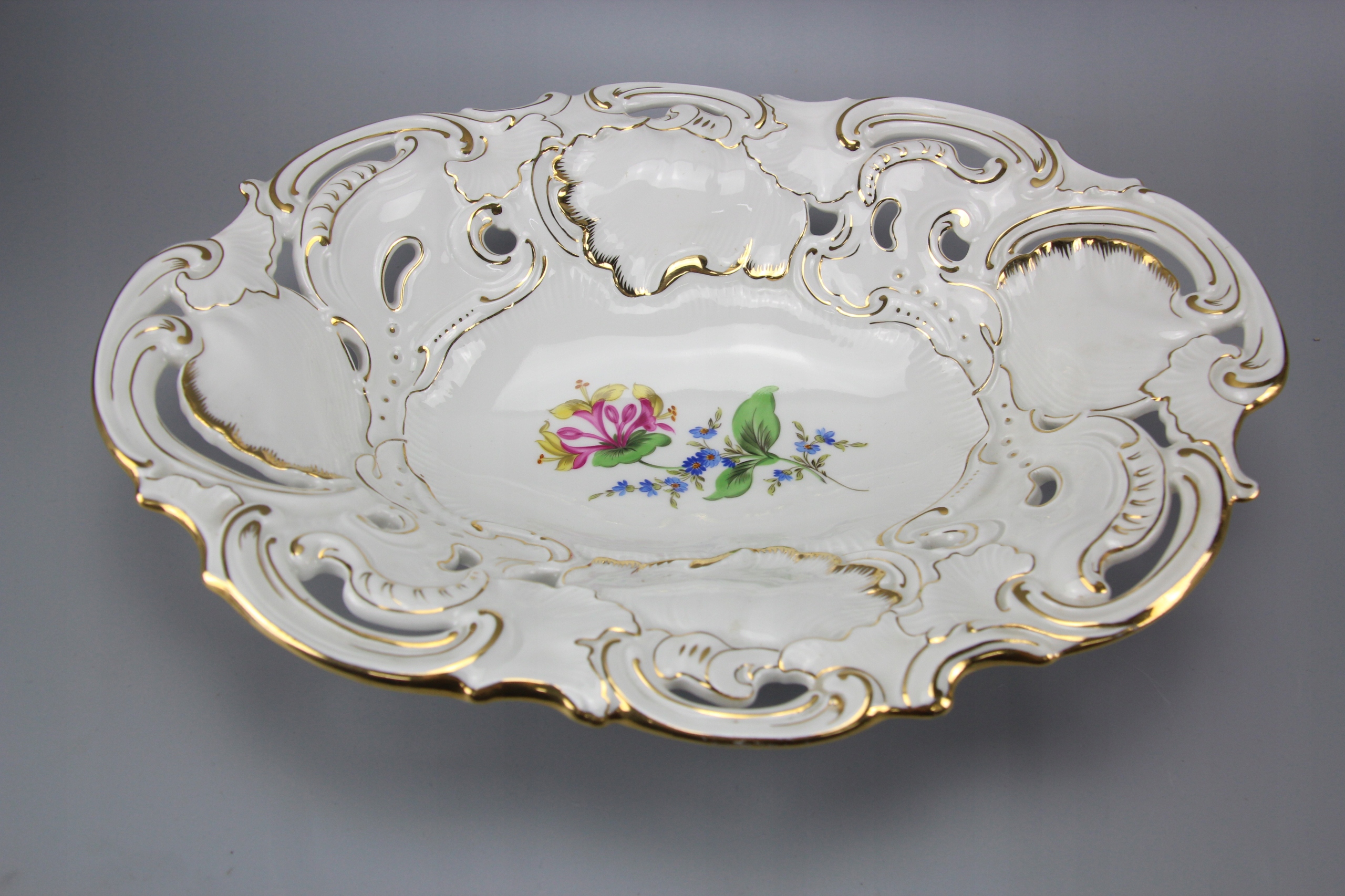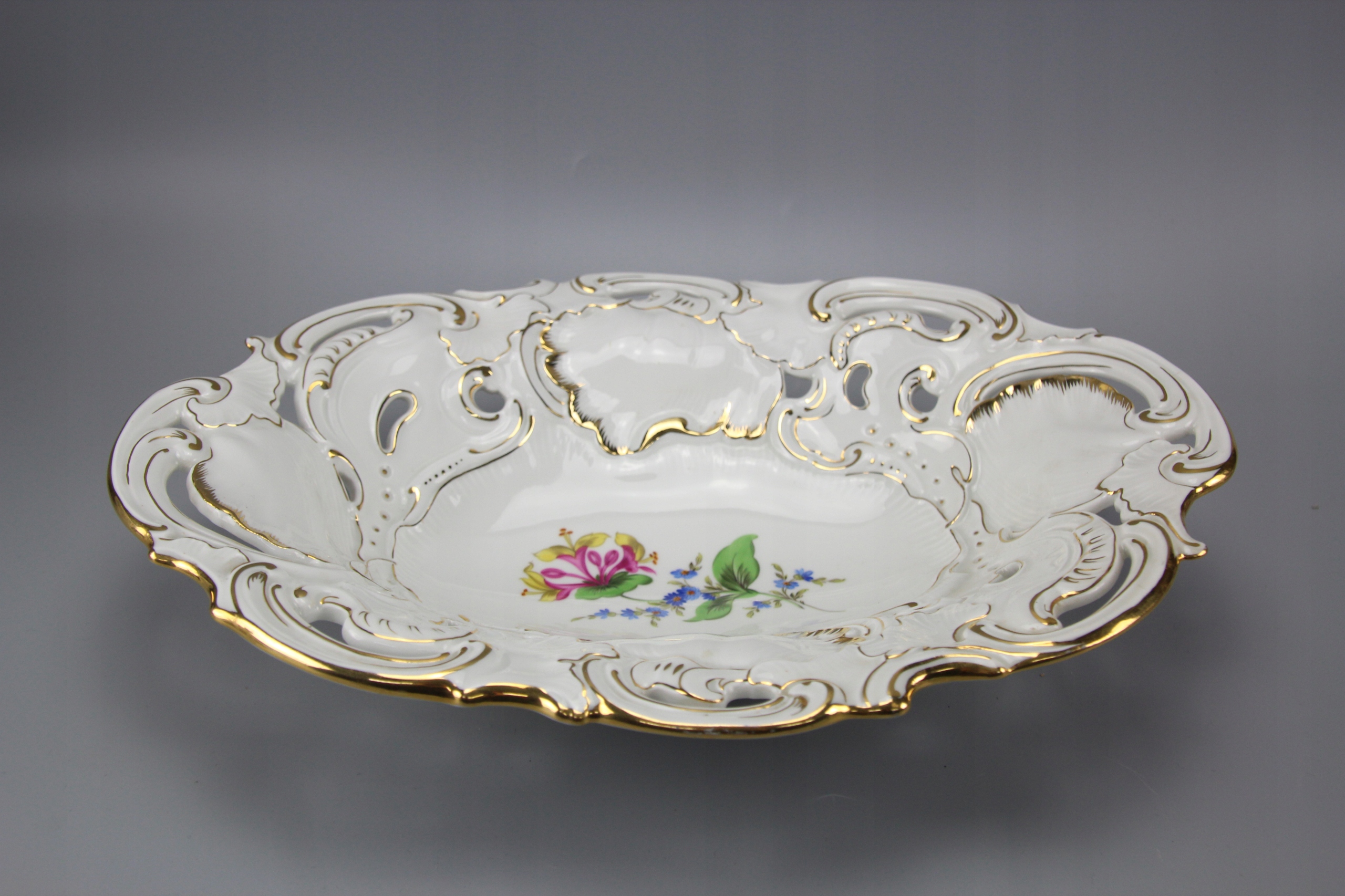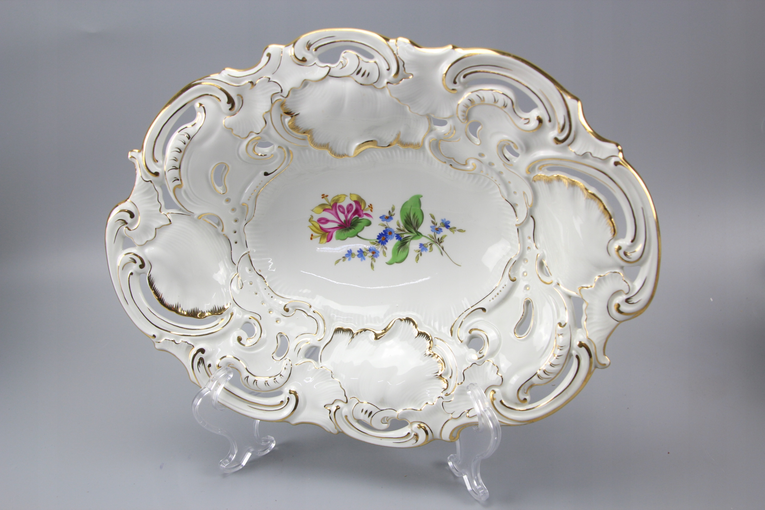 Тарелка овальная с ажурным воротником, украшенная цветочным мотивом;