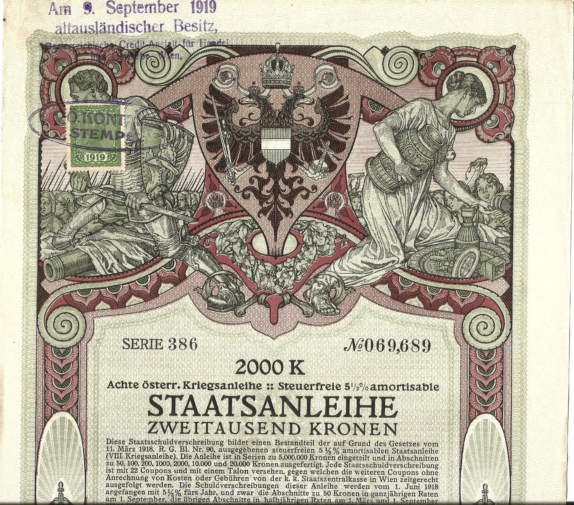 ! И наша идея поделиться этим с другими! Восьмой 5,5% австрийского военного кредита. Две тысячи коронок. Австрийский государственный кредит