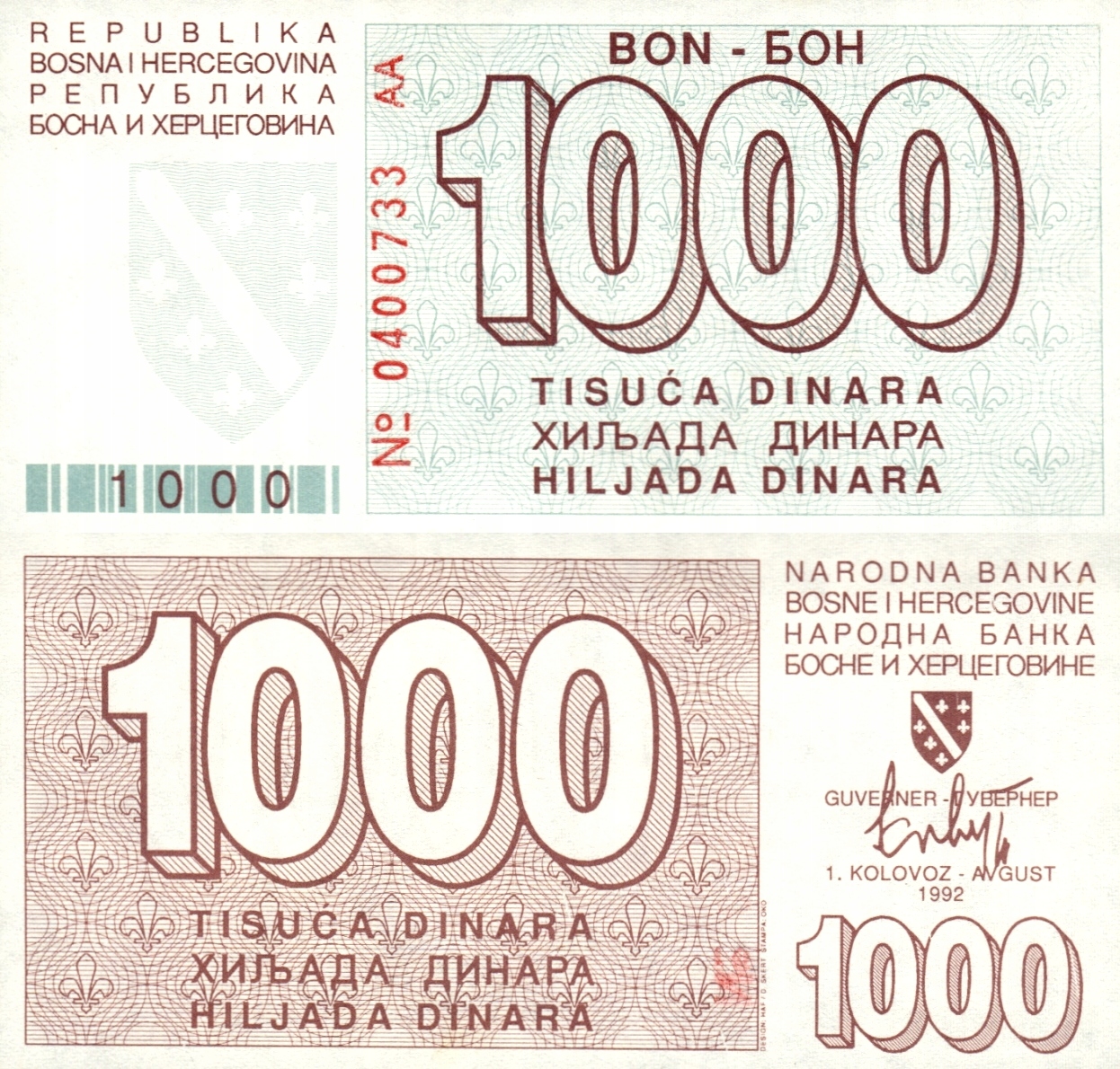 # БОСНІЯ І ГЕРЦЕГОВИНА - 1000 ДИНАРІВ - 1992 - П-26 - UNC (серія АА)