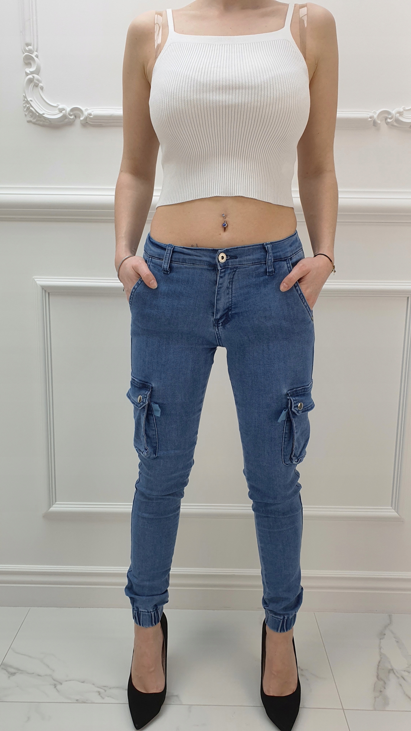 Джинсовые брюки Армейские брюки отлично подходят для спортивной обуви, но также идеальны в сочетании с ней. на высоком каблуке, благодаря своей универсальности, подходят практически к любому стилю. Гибкий материал подчеркивает женскую фигуру. Брюки приталенные и тянутся. Подчеркните свои женственные формы! Сделайте свой повседневный образ уникальным. Брюки имеют карманы с обеих сторон.