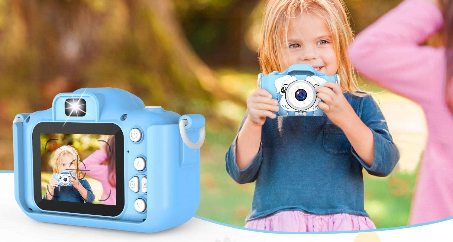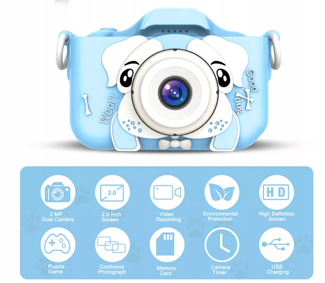 Цифровой детский фотоаппарат Bulldog Full HD 20 Мп. Синий детский цифровой фотоаппарат с накладкой в виде бульдога. Благодаря резиновому чехлу ваша камера защищена от всевозможных падений, ударов и т. д. В комплект также входит шейный ремень, чтобы ваш ребенок не потерял свою первую камеру! Идеальный подарок для маленького любителя фотографии. Технические параметры: Диагональ экрана: 2 дюйма Функции: Фотосъемка и запись видео Две камеры: Передняя/Задняя Формат фото: JPG Камера: 20 мп Запись: 1920*1080 px Максимальное количество фото: 4500 Вес: 85г Емкость аккумулятора: 850 мАч Зарядка время: 2-3 часа. Поддерживается карта памяти максимальной емкостью 32 ГБ. Цвет: Синий В комплект входят: цифровая камера, резиновый чехол в виде бульдога, кабель для зарядки и руководство пользователя. Преимущества нашей камеры: Резиновая крышка, защищающая от повреждений, 3 встроенные игры, Благодаря вашей камере ваш ребенок не испортит вашу технику, Высокое качество фотографий, Возможность записи видео, Фоторамки, которые разнообразят детскую фотографию.