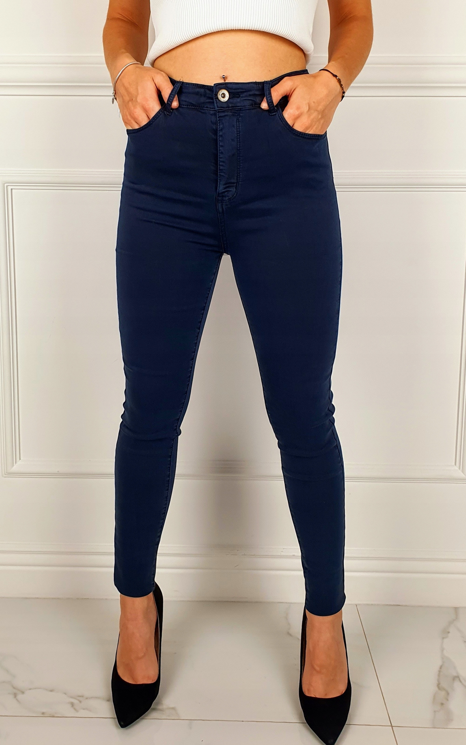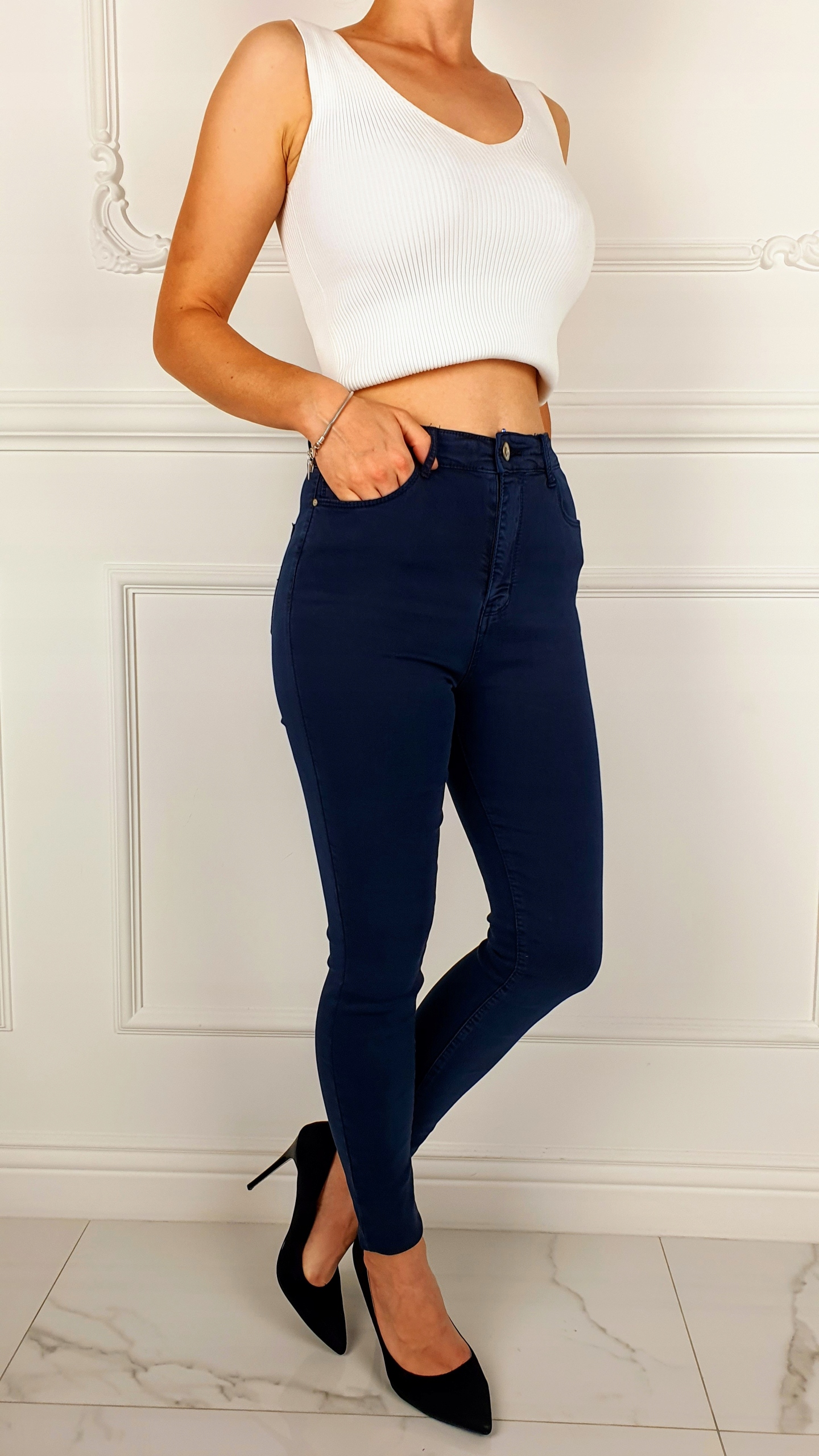 Отличные классические брюки темно-синего цвета с завышенной талией. Отлично подходят для спортивной обуви, но они также идеальны в сочетании с обувью на высоком каблуке, поскольку благодаря своей универсальности подходят практически к любому стилю. Гибкий материал подчеркивает женскую фигуру. Брюки приталенные и тянутся. Подчеркните свои женственные формы! Сделайте свой повседневный образ уникальным. Брюки имеют карманы с обеих сторон.