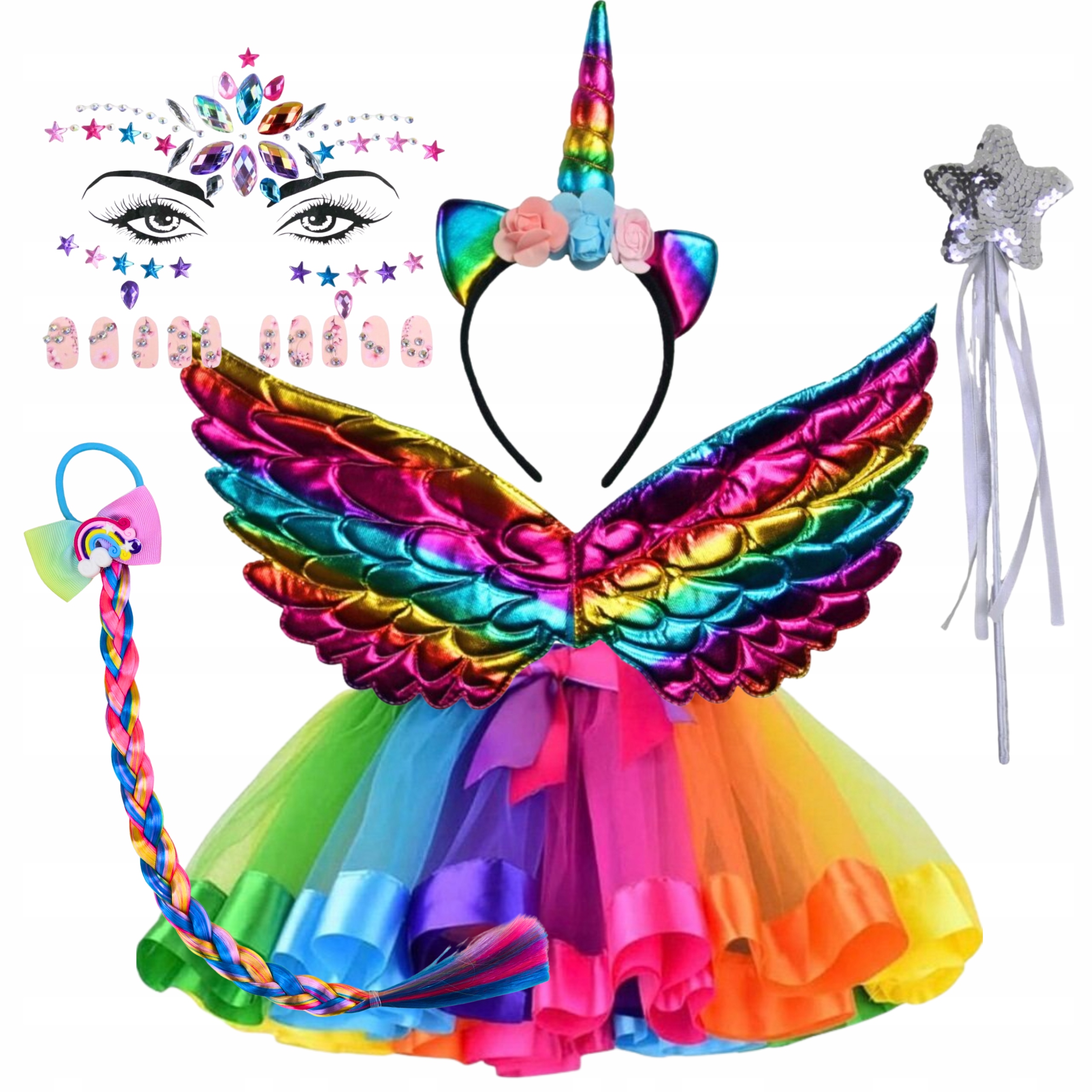 Костюм из 6 частей - тюлевая юбка (без подкладки - с лосинами или непрозрачными колготками) + повязка на голову + палочка + крылышки + резинка с тесьмой + наклейки - набор блестящих кристаллов для украшения лица, ногтей