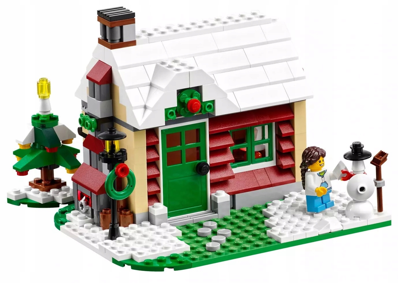 Располагайтесь с комфортом в очаровательном летнем домике. Крыша, покрытая темно-красной черепицей, зеленая входная дверь, красно-белые навесы и разноцветные цветочные горшки. Снаружи на ветке большой яблони сидит маленькая птичка, по дороге проезжает блестящая синяя машина, а солнце греет прекрасный сад с лужайкой, огородом и бассейном. Эта тщательно продуманная модель также включает в себя почтовый ящик, газонокосилку, шезлонг и стол. Разожгите гриль из светлого кирпича или разверните дом, чтобы получить доступ к детальному интерьеру со столом, лампой, стулом и лестницей. Также вы можете изменить время года и перестроить модель в осенний домик в атмосфере Хэллоуина или зимний домик в атмосфере Рождества. В комплект входят 2 минифигурки с аксессуарами: взрослый и ребенок.
