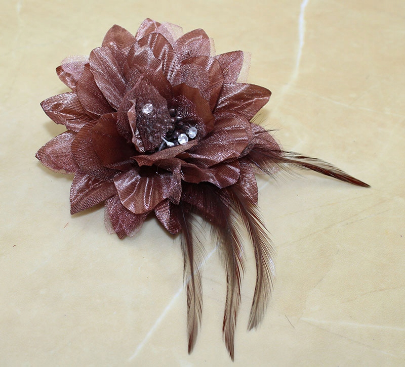 Цветок, на броше и дополнительно с резинкой. Цветок с хлопьями, изготовленными из блестящего материала, жесткой матовой атласной и слегка блестящего тюля. Центр тростника - тычинки, увенчанные мерцающими цирконами. Целое дополняется перьями на одной стороне цветка. Украшение может быть прикреплено к созданию или украшению прической, кокой благодаря эластичной ленте. Цветок для использования в повседневной и вечерней стилизации.