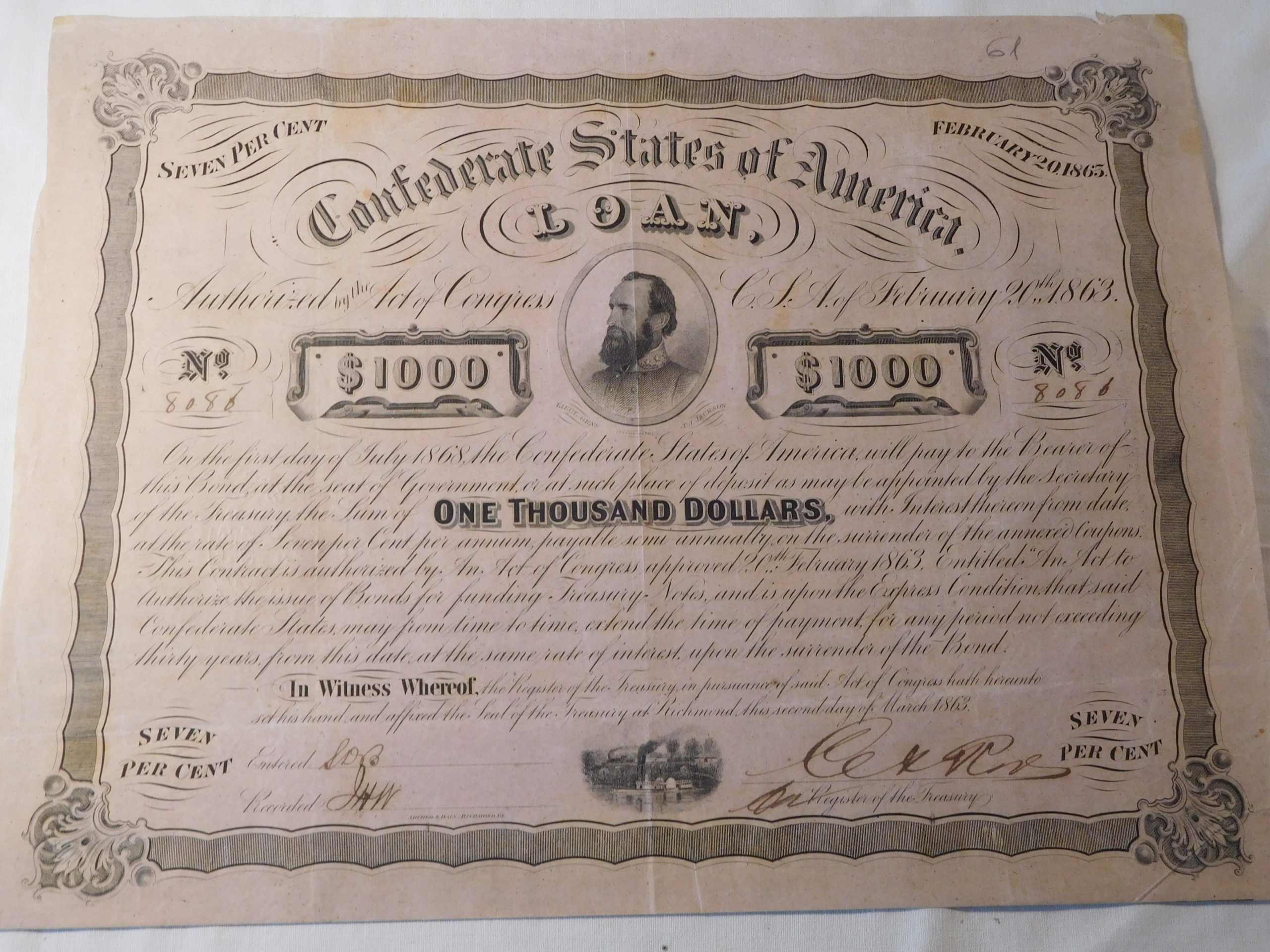 Ричмонд 2 III 1863, 35 x 27 см, купоны - да 9, подпись - Пен, Чарльз А. Роуз, категория - Государственные облигации, номинант - 1000 долларов США. Арт -нуво в США 1861–1865. Южные штаты, когда они выполняют, проводили такие виды деятельности, как независимое государство, включая проблему своих собственных облигаций для потребностей войны в профсоюзе. Декоративные мотивы с виньеткой с изображением генерала Джексона. Нижняя меньшая изображает водительский поезд на фоне плавного парохода. Справа на верхнем краю с карандашом "61"-number из объекта коллекционера.