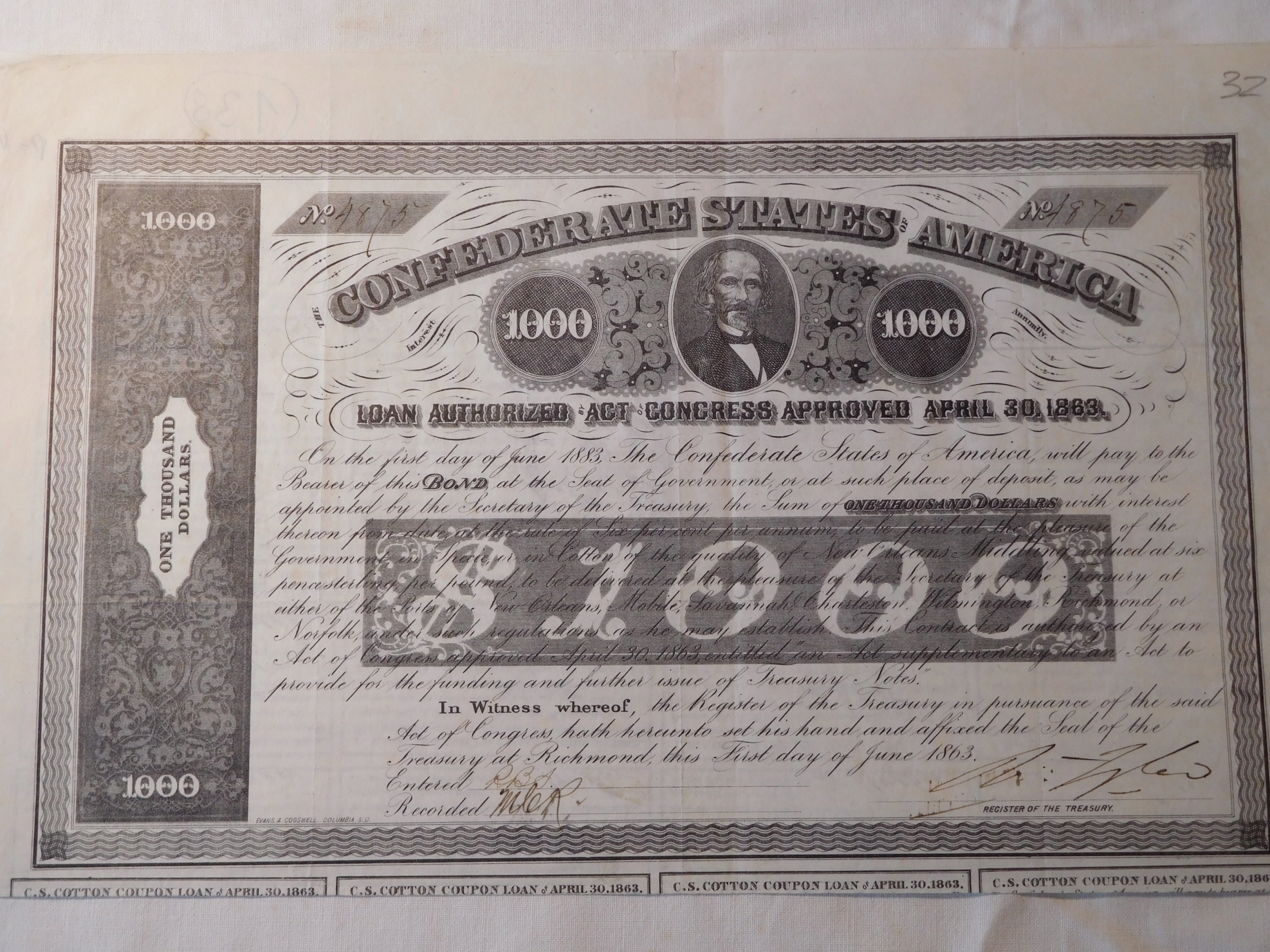 6% облигаций Конфедерации периода Гражданской войны в США 1861–1865 гг. При отделении южные штаты действовали как независимое государство, в том числе выпускали собственные облигации в целях войны с Союзом. Декоративные мотивы с виньеткой, изображающей одного из лидеров Конфедерации. Справа в верхнем поле карандашом "32" - номер коллекционной вещи.