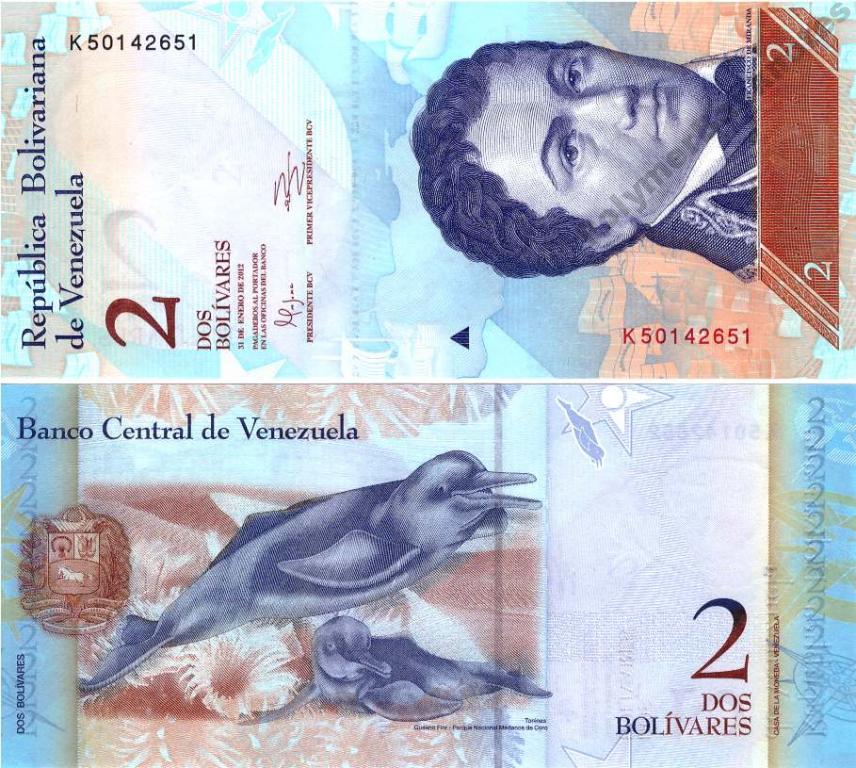 Аукционная банкнота номиналом 2 боливара фуэрте относится к пятому (?) выпуску (ДАТА: 31.01.2012, префикс К, подписи как на фото, отличаются от предыдущих выпусков) .