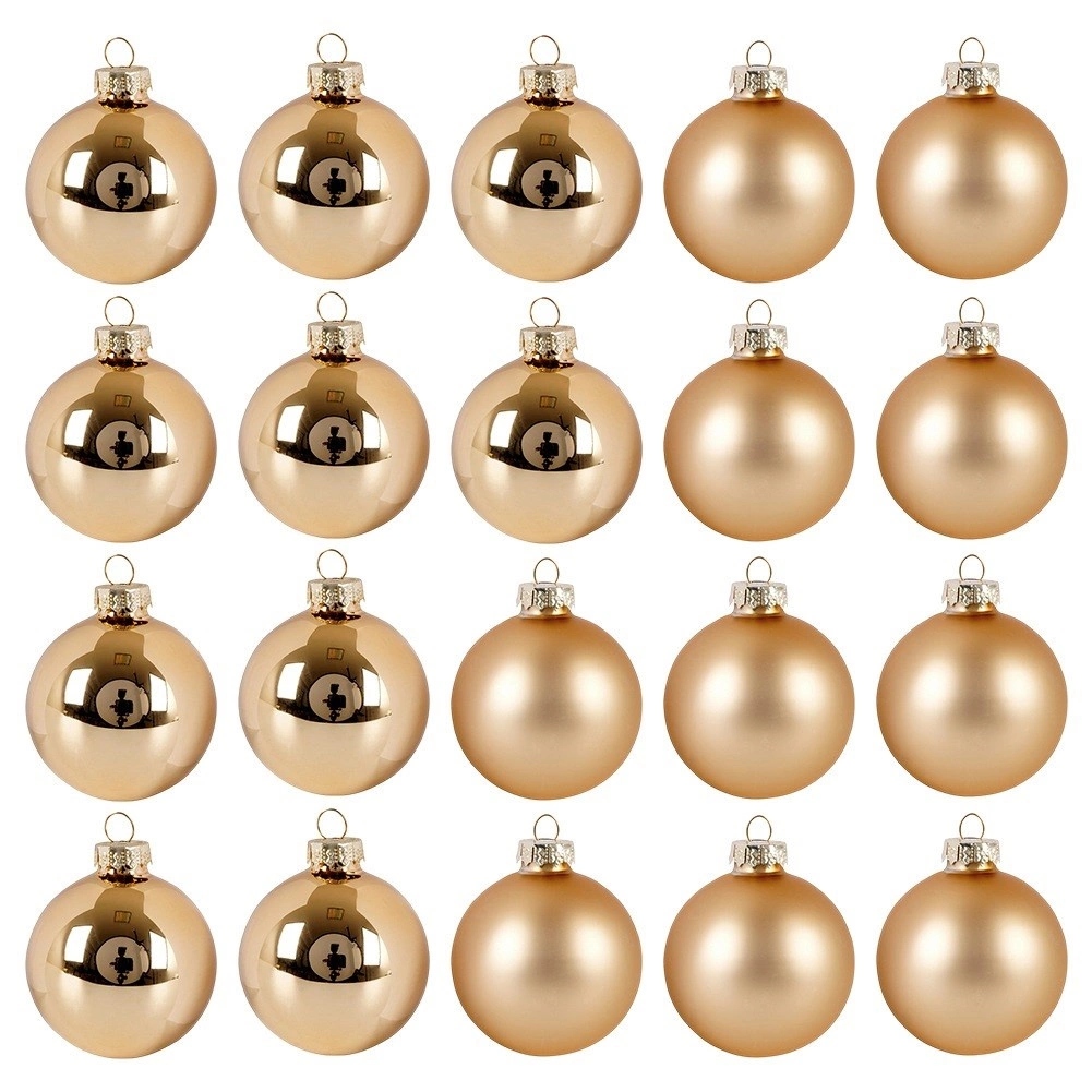 - набор из 20 шт. Рождественские безделушки - набор из 20 золотых безделушек, которые добавят великолепие к каждой рождественской елке и создают волшебную атмосферу дома. Каждый из безделушек имеет диаметр 6 см. Включено в Золотые безделушки в глянцевой и матовой версии.