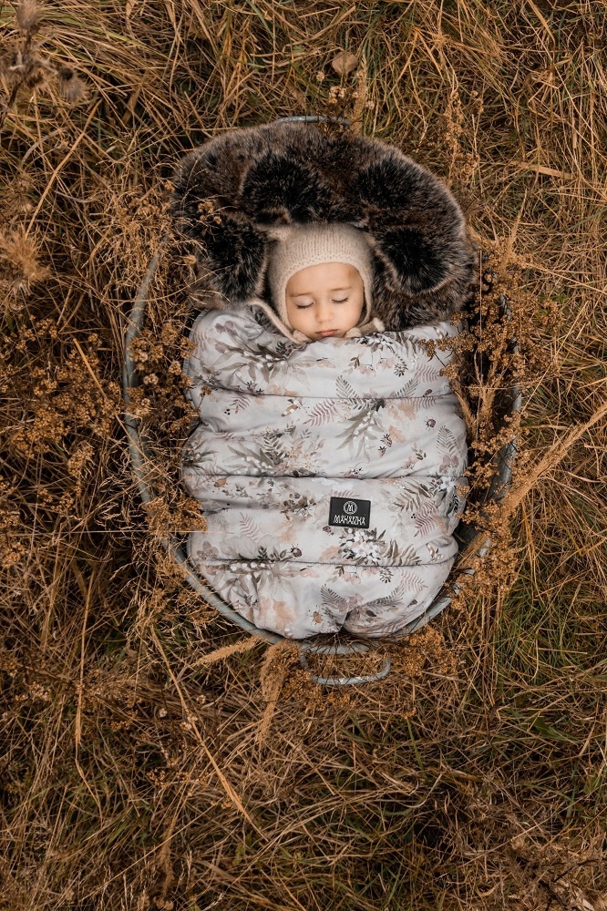В верхней части вшита прочная резинка, как в капюшоне, так и в чехле. Затянув резинку, мы сможем еще лучше защитить малыша от холода и ветра.