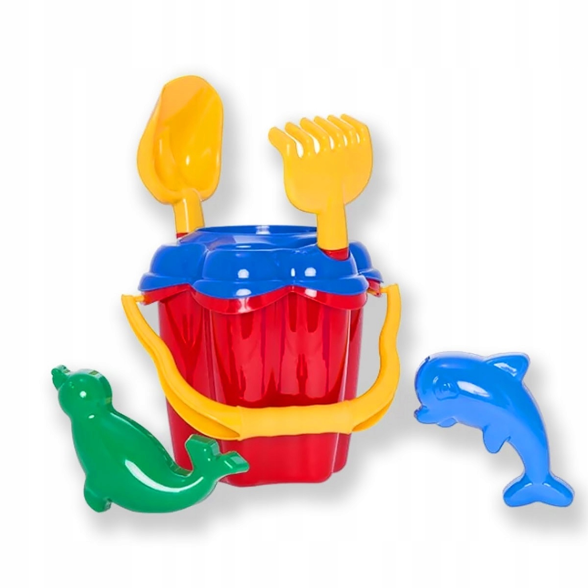 В набор входит ведро «Цветок» с ситечком, 2 формочки-дельфина и тюлень, лопатка и грабли. Наш малыш точно не будет скучать на пляже. Создание песочных лепешек стимулирует у ребенка творческое мышление и действие.
