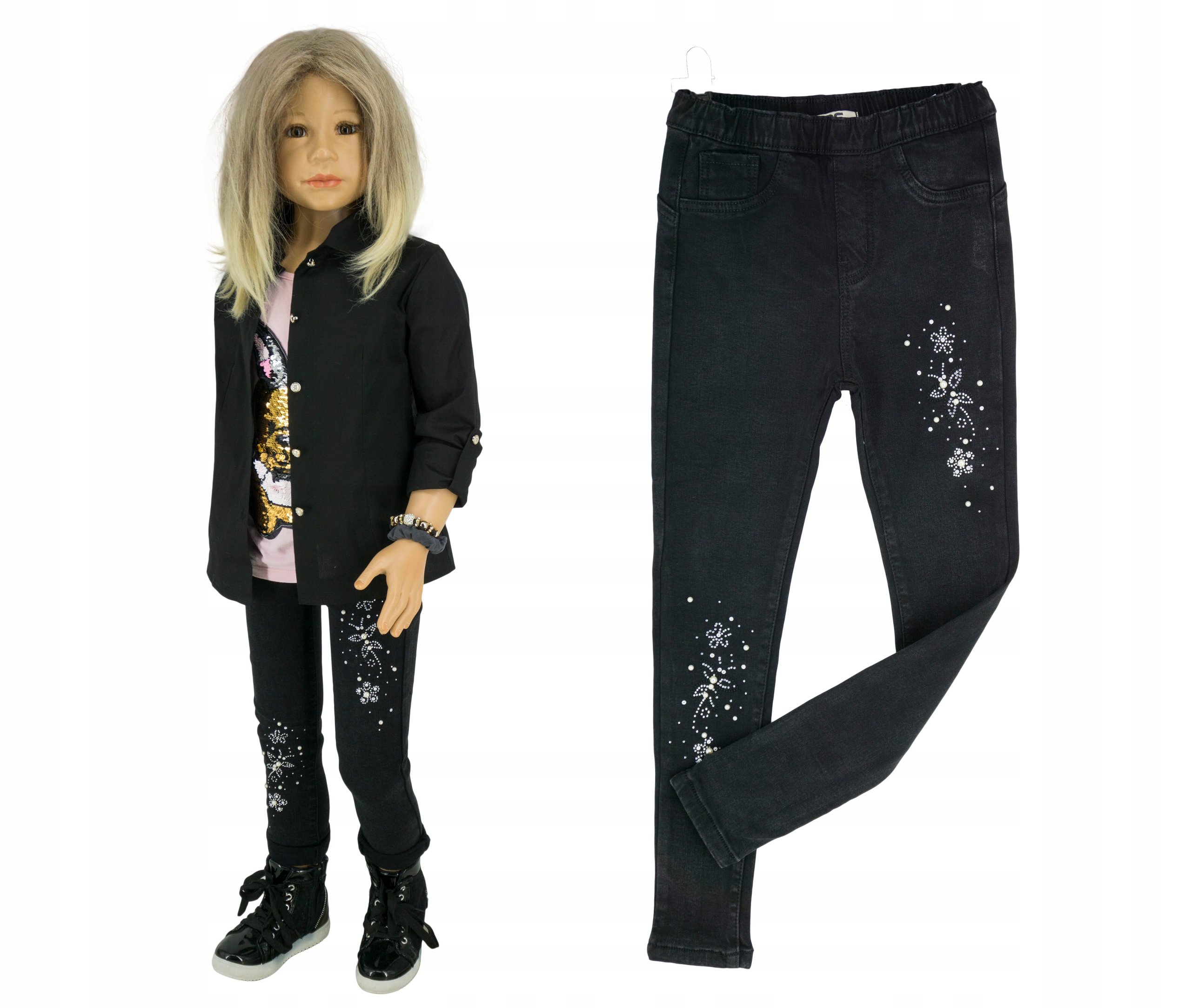 - Узкие штанины, украшенные жемчугом и стразами