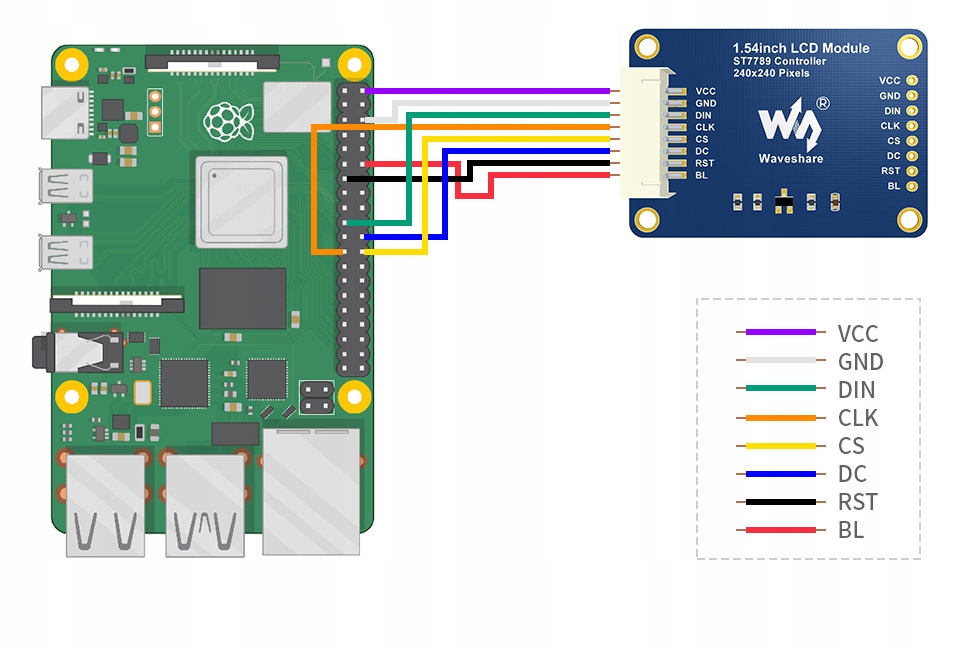 Встроенный драйвер ST7789, использующий шину SPI. Поставляется с примерами для Raspberry Pi, Arduino, STM32 и т. д.