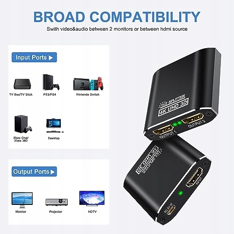 【Широкая совместимость】Совместимость с HDMI 1.4/1.3/1.2, поддержка HDCP 1.4 (НЕ обходит HDCP), разветвитель HDMI подходит для большинства устройств со стандартным интерфейсом HDMI. Вход: компьютер, XBox 360, XBox one, PS3, PS4 Pro, Fire Stick, проигрыватель Blu-Ray DVD, спутниковый ресивер, Route Roku, Chromecast, ПК, проекторы и т. д. Выход: HD-Ready, телевизоры Full HSD, Apple TV , телевизоры, мониторы Samsung и т. д.