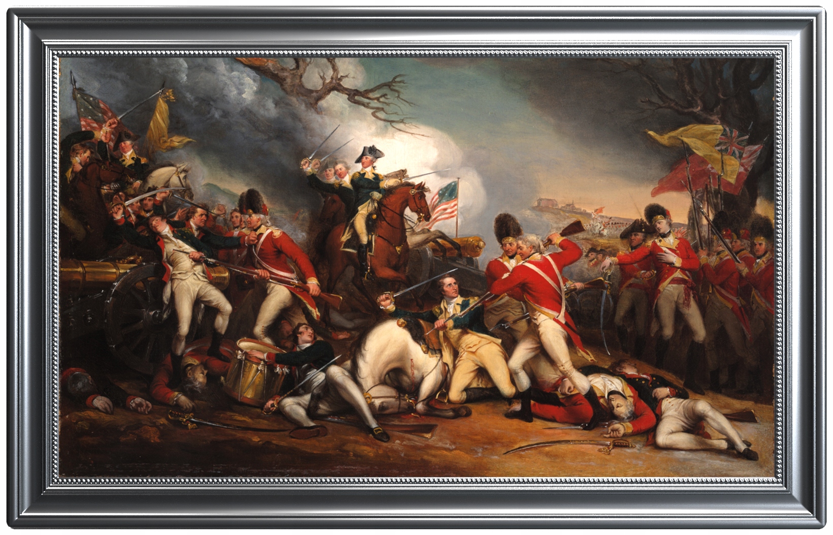 Монета из чистого серебра весом в 1 унцию с фотографическим качеством репродукции работ Трамбулла представляет собой идеальное сочетание искусства, истории и мастерства высочайшего класса. На нем изображен смертельно раненый генерал Хью Мерсер в окружении сражающихся солдат, на заднем плане приближается верхом на коне фигура Джорджа Вашингтона — символ надежды и повеления. Хотя сцена содержит символические элементы, она прекрасно отражает дух борьбы за свободу.