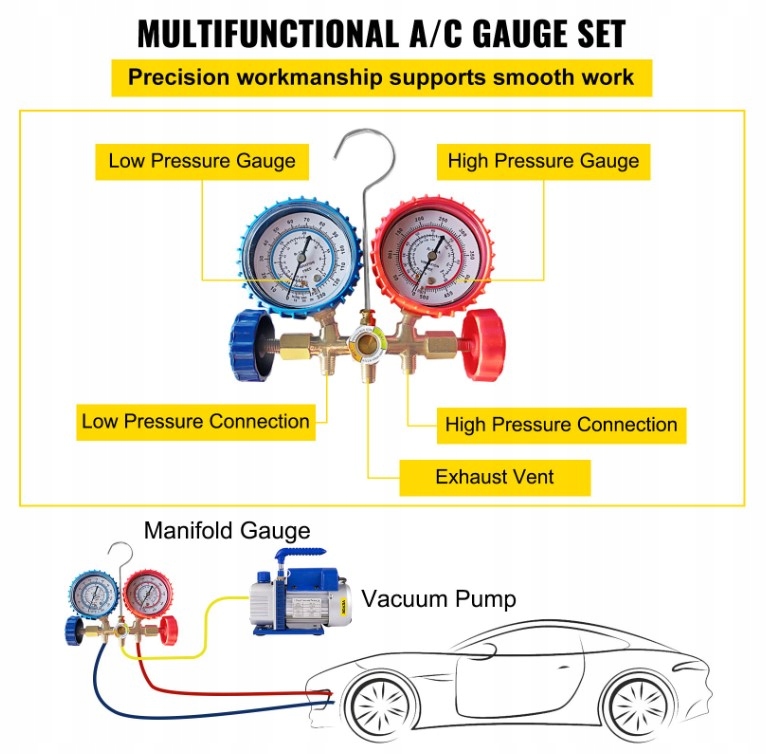 Тщательное измерение и визуальный контроль : в установке многофункциональный набор манометрий для дистрибьютора является ясным и просты для дистрибьютора. Чтение двух манометра и специально разработанного, увеличенного образца позволяет легко управлять потоком хладагента. Стандартный SAE 1/4 "развязка гарантирует совместимость с большинством систем, в то время как измерительные компоненты допускают точные измерения, а также быстрые диагностики и обслуживание. Нефть.