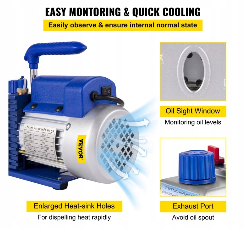 Высокая производительность: Этот вакуумный насос охлаждающего коэффициента характеризуется высоким воздушным потоком 4 CFM и мощностью двигателя 1/3 HP, что гарантирует стабильную и эффективную работу в различных условиях работы. Максимально достижимый уровень вакуума составляет всего 5 пА (0,05 мбар), что позволяет вам получить глубокий вакуум и соответствовать требованиям точной механики или лабораторий. Алюминиевое корпус давления -это легкое, стабильное и устойчивое к коррозии, а композитная резиновая площадка на дне эффективно предотвращает скольжение, уменьшает вибрации и, таким образом, улучшает стабильность работы.