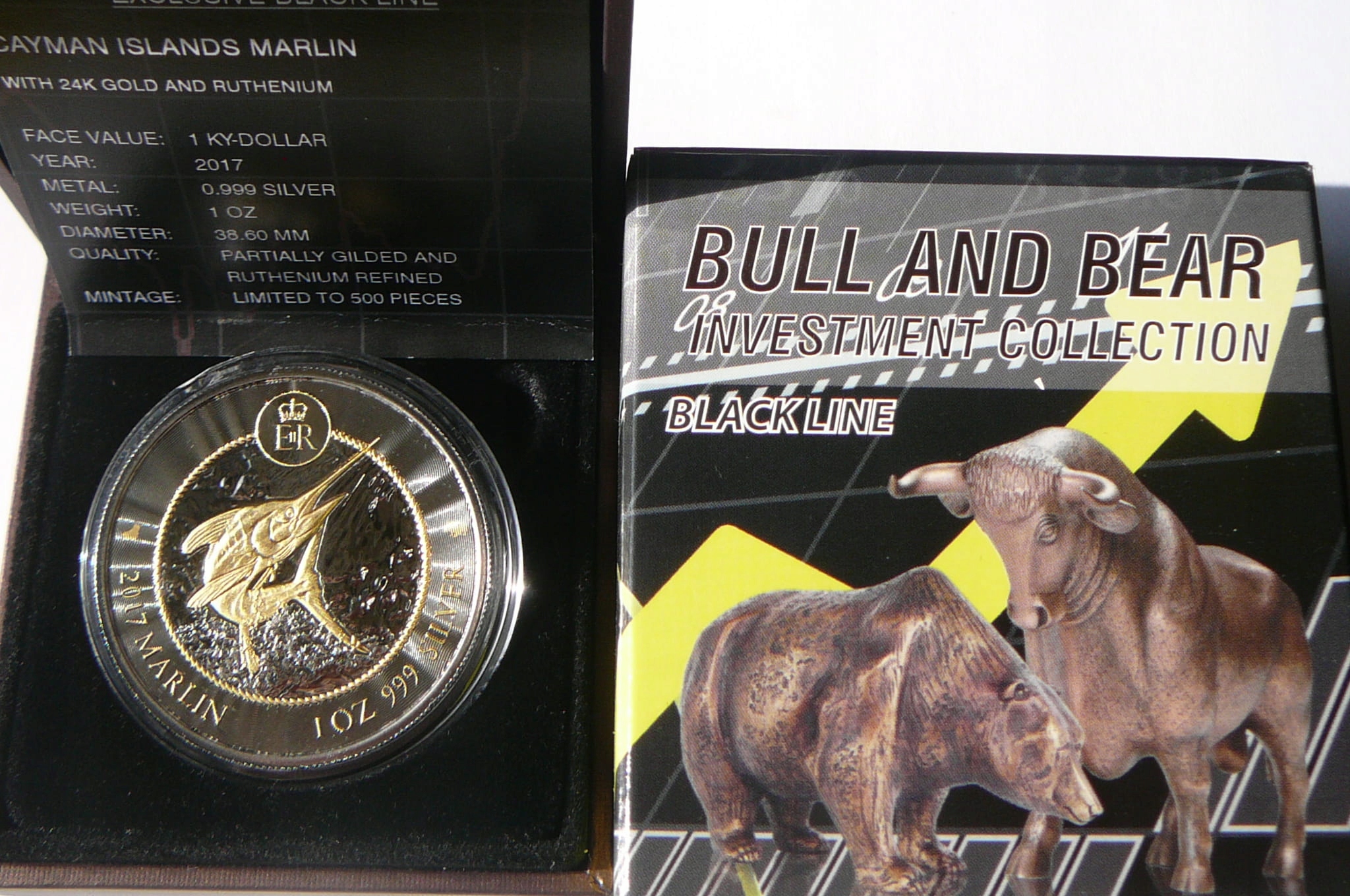 ВЫСТАВКА НА АУКЦИОН КРАСИВАЯ ОРИГИНАЛЬНАЯ И РЕДКАЯ ИНВЕСТИЦИОННАЯ МОНЕТА СЕРЕБРЯНАЯ, ПОКРЫТАЯ 24-КАРАТНЫМ ЗОЛОТОМ И РУТЕНОМ - ДОЛЛАР - КАЙМАНОВЫ ОСТРОВА 2017 - СИНИЙ МАРЛИН - серия: БЫК и МЕДВЕДЬ / БЫК и МЕДВЕДЬ -ЧИСТОЕ СЕРЕБРО/ЗОЛОТО 999 - УНЦИЯ - ЧЕРНЫЙ РУТЕНИЙ - МЯТА - РЕДКАЯ - ЧЕРНАЯ ЭНИГМА - РЕДКОСТЬ - МИНИСТЕРСТВО ВСЕГО 500 ШТУК!! + СЕРТИФИКАТ ПОДЛИННОСТИ + ФУТОЛ + КАРТОН -МОНЕТЫ ЭТОЙ СЕРИИ ПРЕДЛАГАЮ НА ДРУГИХ АУКЦИОНАХ - ПОСМОТРЕТЬ