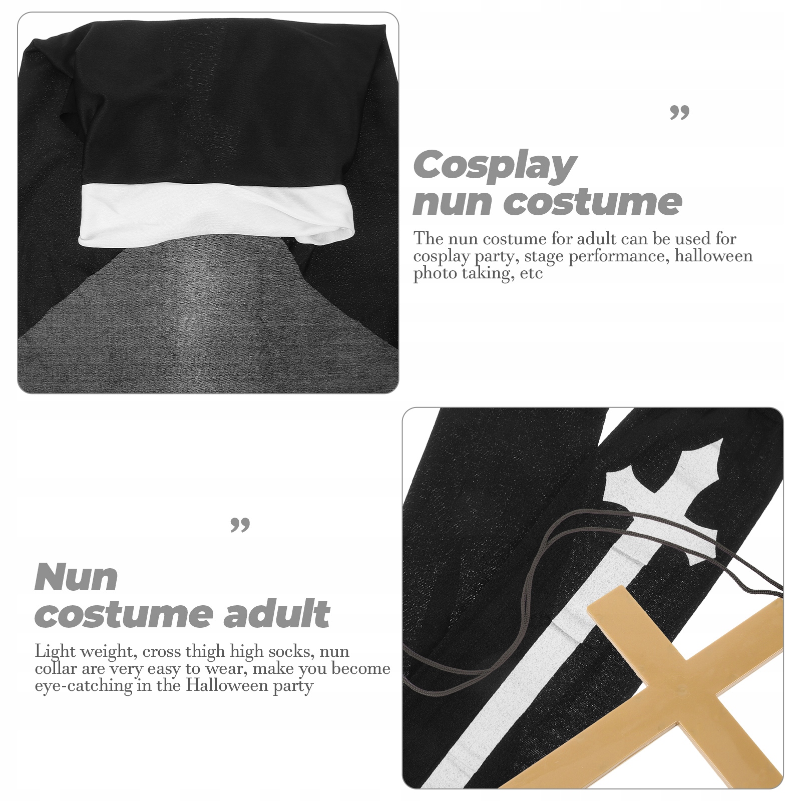 Комплект костюма взрослой монахини, изготовленный из прочного текстильного материала, может обеспечить длительный срок службы. Комплект костюма монахини можно использовать для женщин, он декоративный, уникальный и шикарный. Может широко использоваться для косплея, выступлений на сцене, вечеринок в честь Хэллоуина и других случаев.