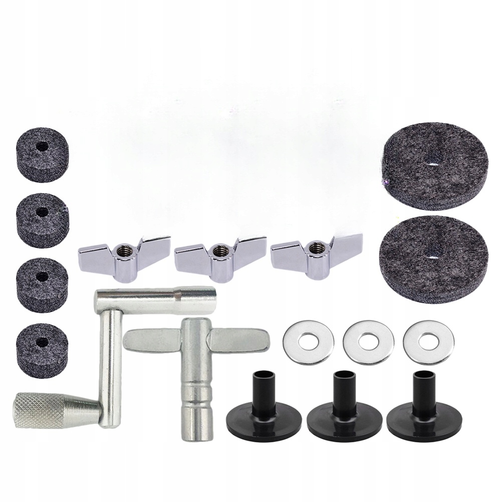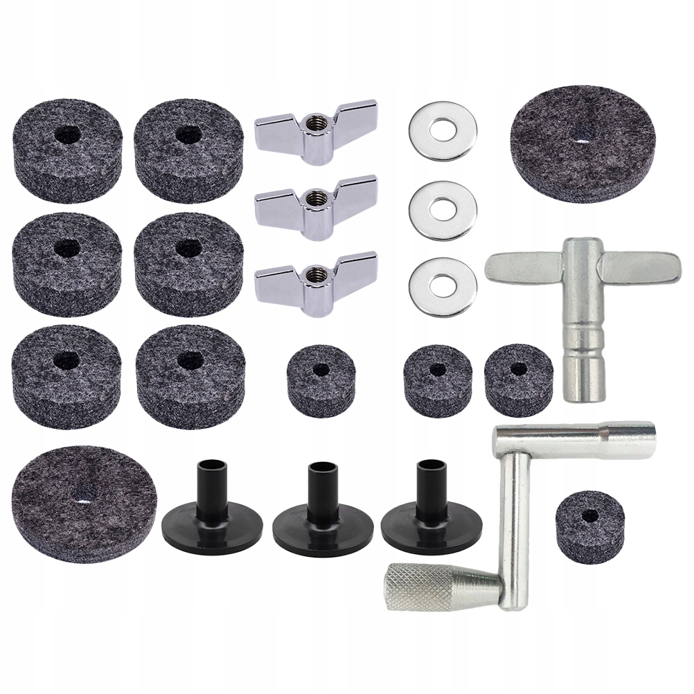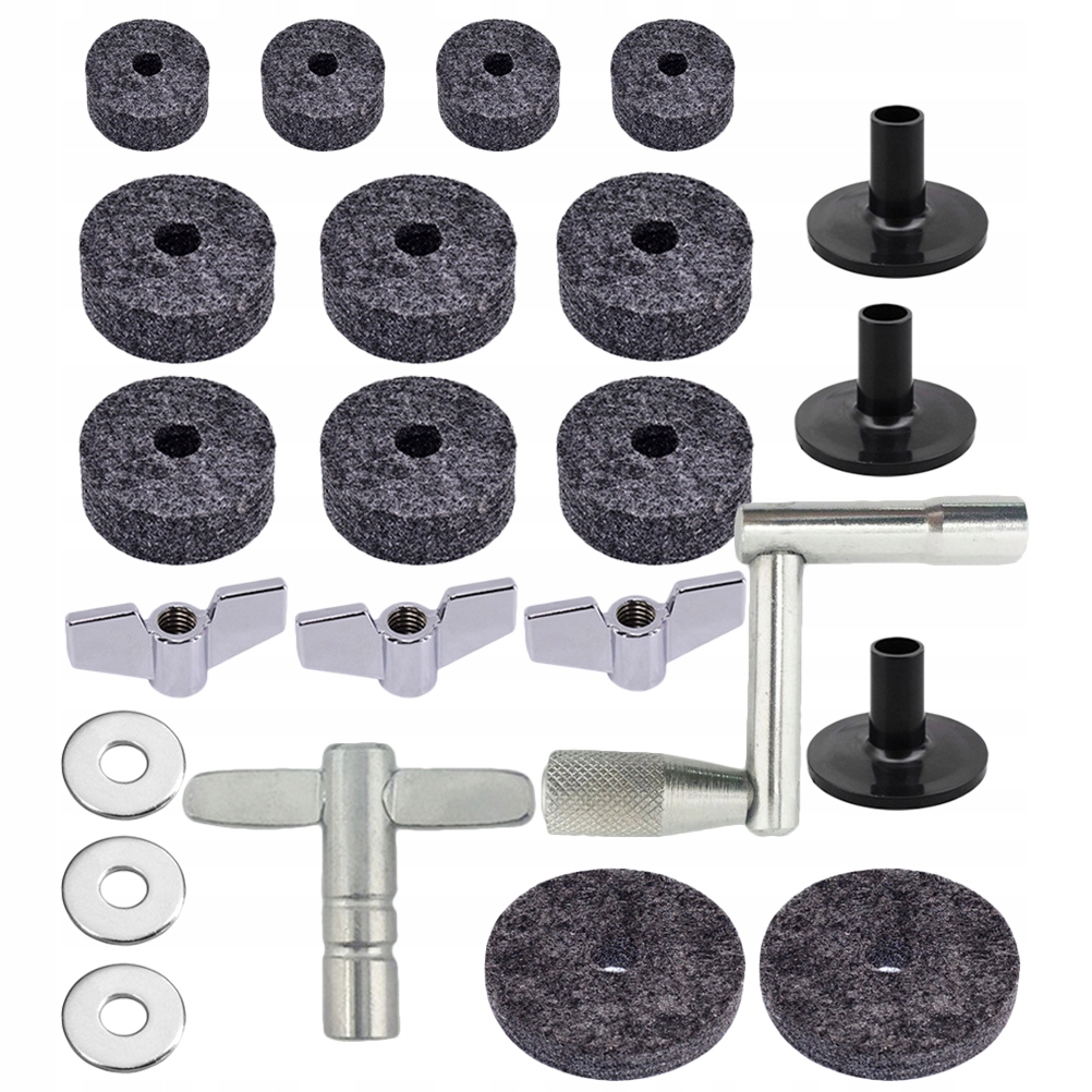 ✅ 4 фетровых подушечки 2,5 см 6 фетровых подушечек 4,0 см 2 фетровых подушечки 5,0 см 3 гайки 3 шайбы 3 втулки для тарелок 1 барабанная клавиша 1 барабанная клавиша