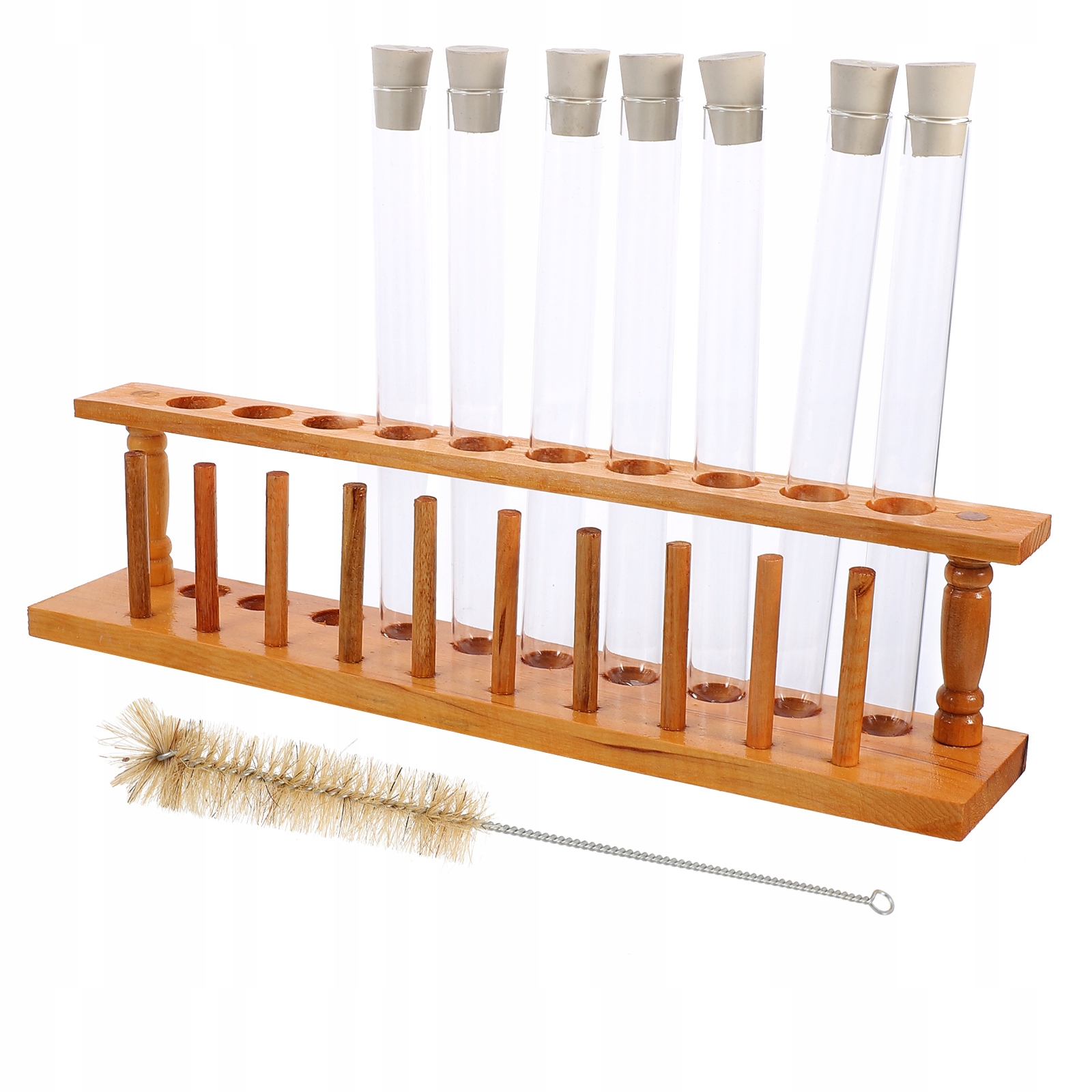 В комплект входят 10 стеклянных пробирок с резиновыми пробками, 1 деревянная подставка для пробирок с 10 отверстиями и 1 щеточка для чистки.
