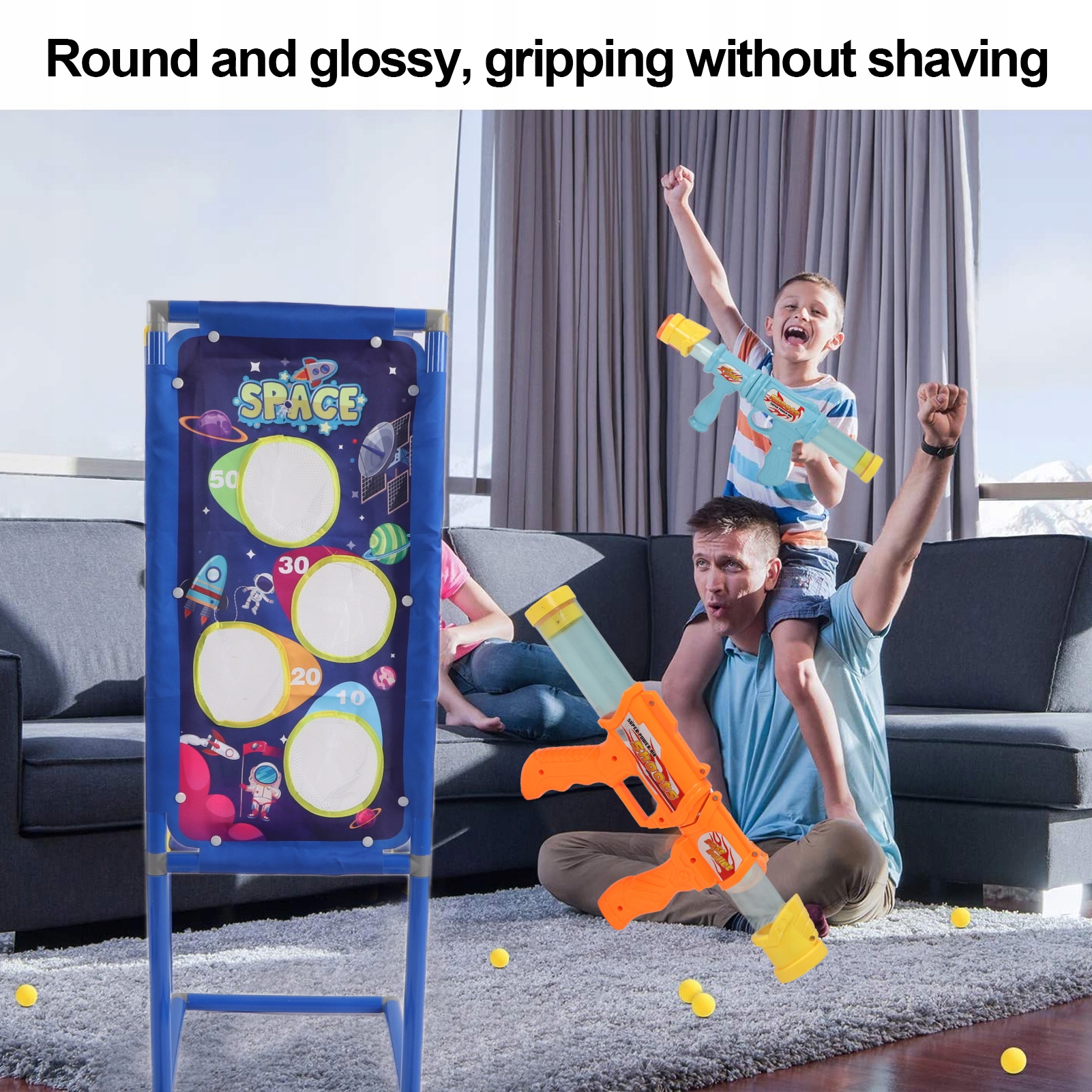 1, круглая, глянцевая, ручка не царапается, закругленная форма, прецизионная шлифовальная кромка, глянцевое прикосновение к корпусу пистолета удобное 2, простое управление, эффективная дистанция стрельбы близка к 10 метров, мягкие пули, безопасные 3, повторяющиеся, игровые, доставляющие удовольствие и удовлетворение езда на велосипеде, многократная стрельба 4, подставка для мишеней устойчива, прочна и долговечна, а крутой космический рисунок привлекает внимание детей, легкий, удобный для переноски 5, четыре мешки, предназначенные для предотвращения разбега мячей, 10 очков, 20 очков, 30 очков, 50 очков, четыре очка.