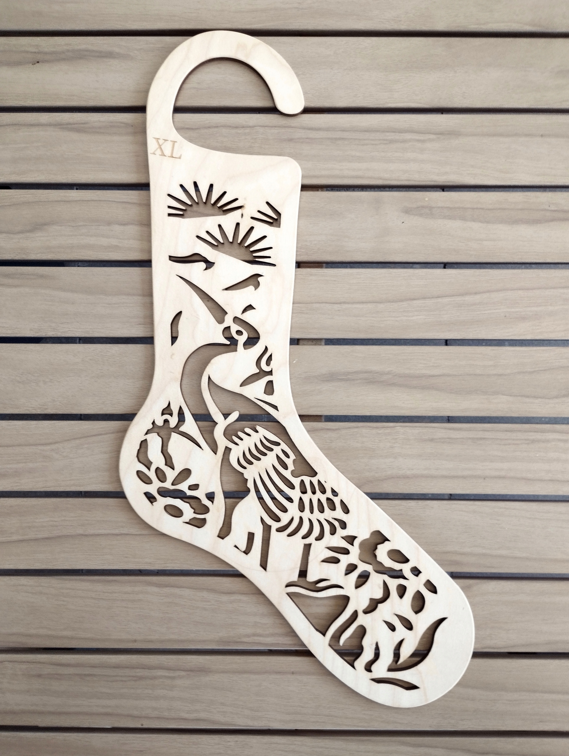 Блокировщик носков XL (EU 41–43) из березовой фанеры толщиной 5 мм, трижды покрытый акриловым лаком на водной основе - это элегантный и прочный инструмент, идеально подходящий для блокирования, сушки и презентации вязаных носков.