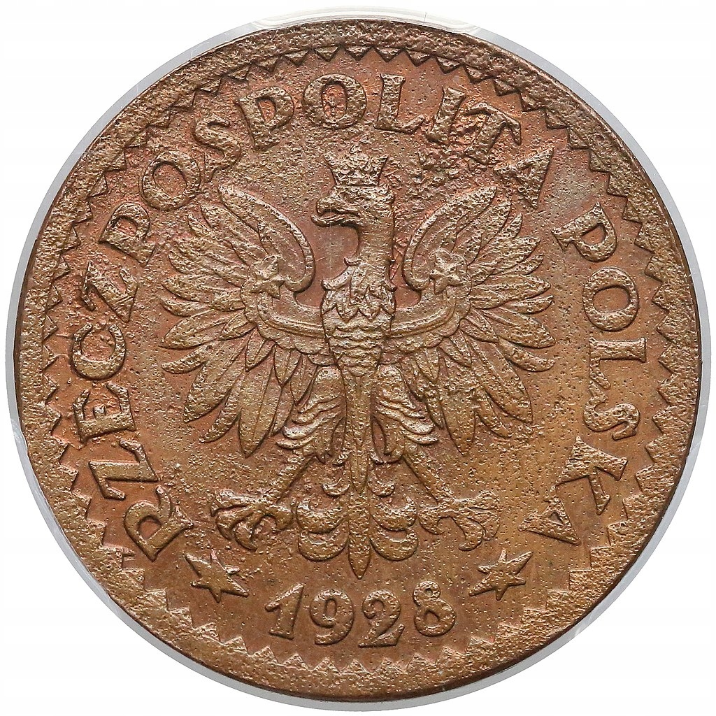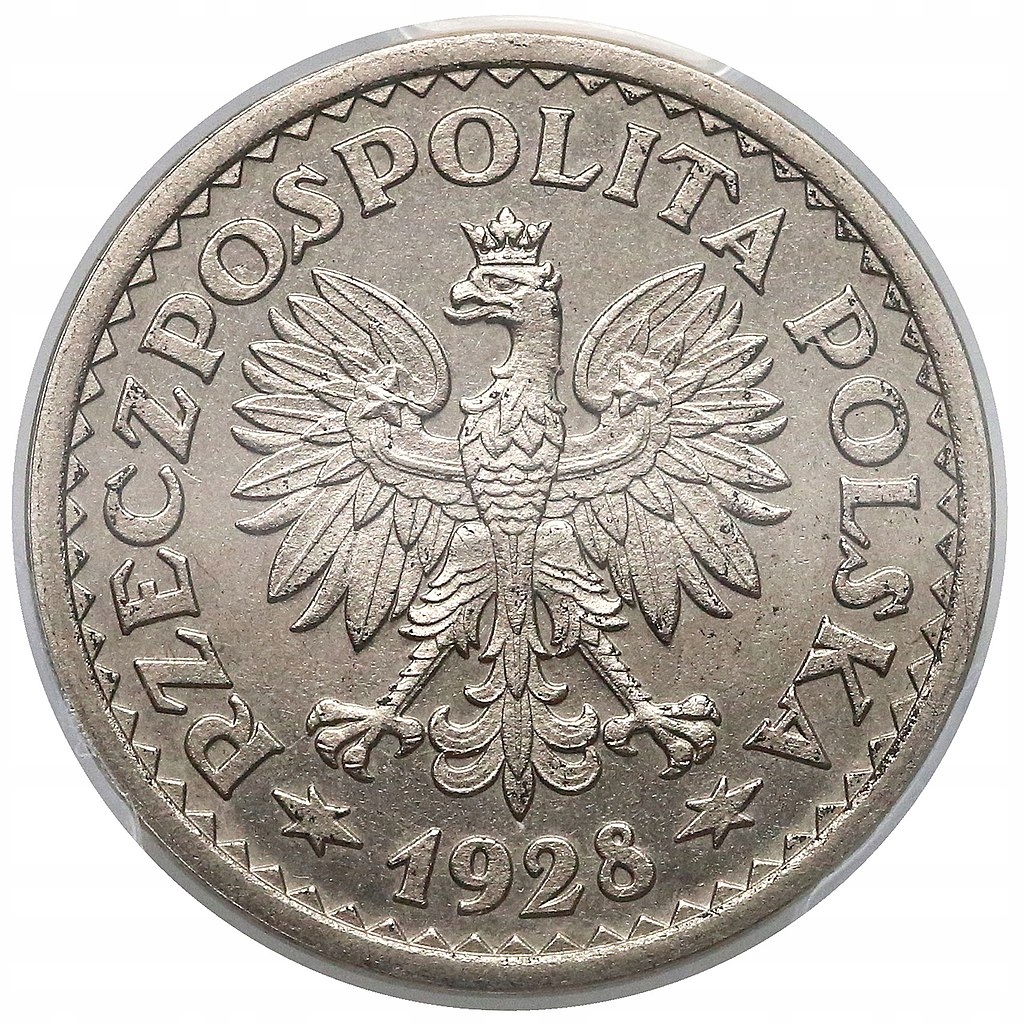 Оформление реверса — номинал «1», окруженный венком из колосьев, под ободком надпись «GOLD», за которой расположен герб Костеша — клеймо монетного двора в Варшаве. На аверсе герб - орел в короне по образцу декабря 1927 года с надписью вокруг него: "RZECZPOSPOLITA POLSKA", в самом низу год - "♦ 1928♦", по обеим сторонам которого расположены сплюснутые шестиконечные звезды. Монета отчеканена на Государственном монетном дворе, с гладким краем, на диске диаметром 25 мм в: