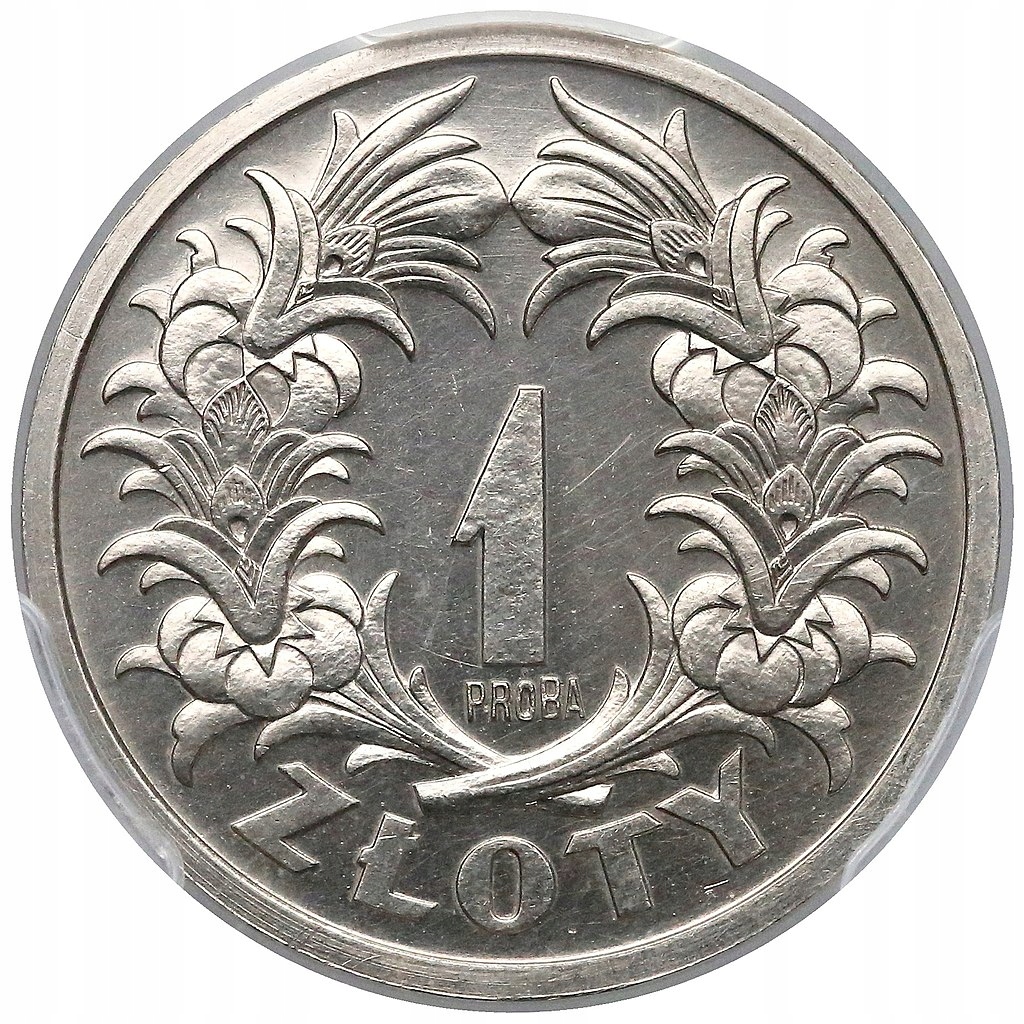 На фотографии ниже изображена оригинальная монета в пруфе с надписью PROOF и развязанным цветочным венком, отчеканенная с реверсом, разработанным Юзефом Амиллером, и аверсом М.Котарбинского, используемым для обращения никелевых злотых. Оформление реверса - номинал "1", под ним - выпуклая надпись "PRÓBA", окруженная внизу развязанным венком из листьев и плодов, а под ней - обрамленная надпись "GOLD". На таверсе герб - орел в короне по рисунку декабря 1927 года, с надписью по краю: "RZECZPOSPOLITA POLSKA", в самом низу дата - "♦ 1929 год. ♦ Монета отчеканена на Государственном монетном дворе, с гладким краем, на диске диаметром 25 мм из никеля, тиражом 115 штук. Имеется второй дизайн. Реверс Юзефа Аумиллера с венком из цветов и фруктов, завязанным внизу.
