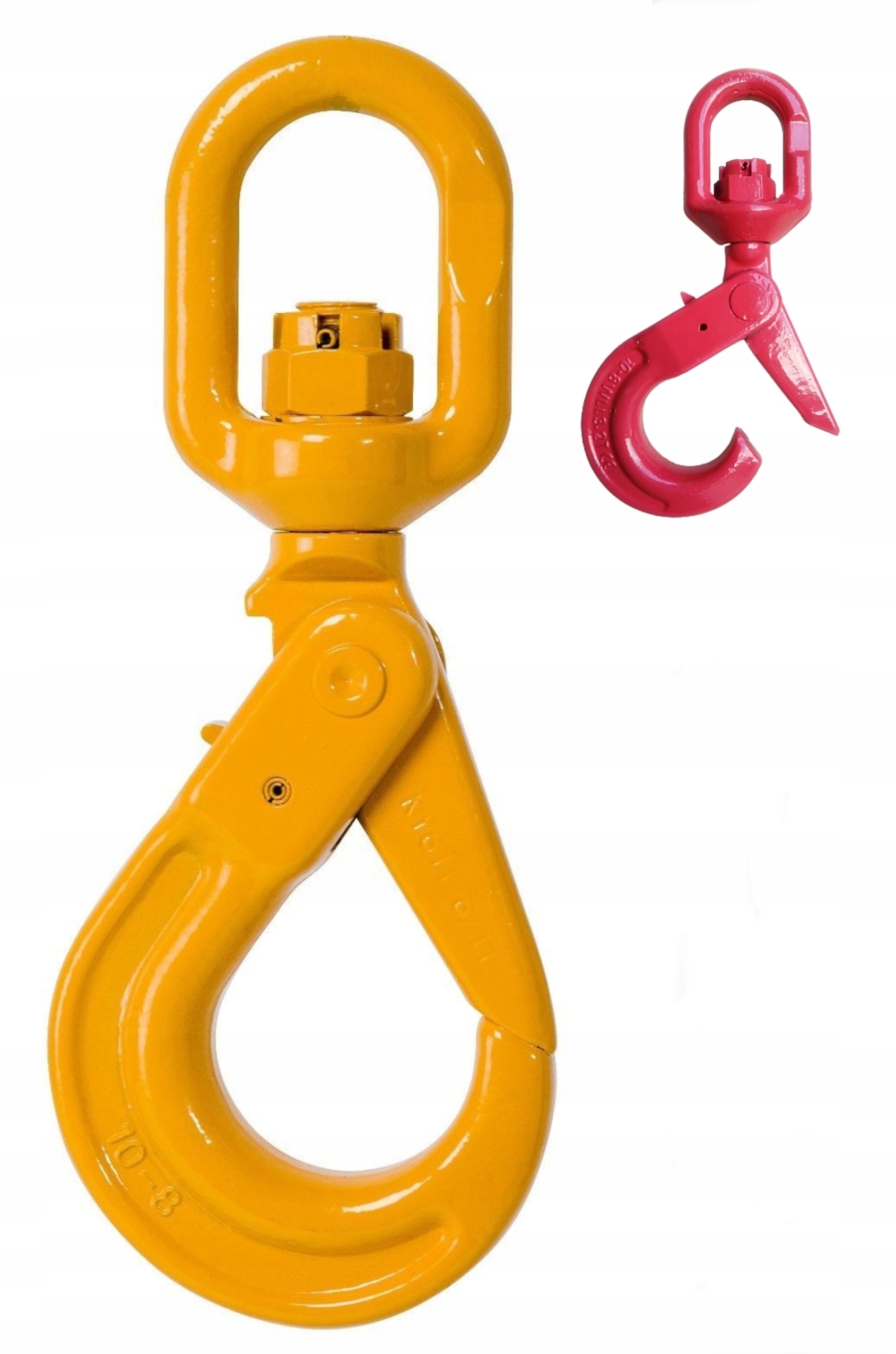 Крюк с вращающееся звено поворотного типа на подшипнике скольжения, что позволяет ему свободно вращаться вокруг собственной оси с сохранением равномерной нагрузки с возможностью компенсации осевого люфта. Крючок автоматически фиксируется, когда вы начинаете поднимать, он оснащен защелкой, предотвращающей открытие крюка.Крюк покрыт порошковой краской желтого или красного цвета / цвет зависит от поставки / изготовлен из капельного материала. -кованая легированная сталь 8 класса прочности. Крюк имеет фиксатор, который не дает веревке или другой веревке ослабнуть под нагрузкой, что делает его безопасным в использовании.