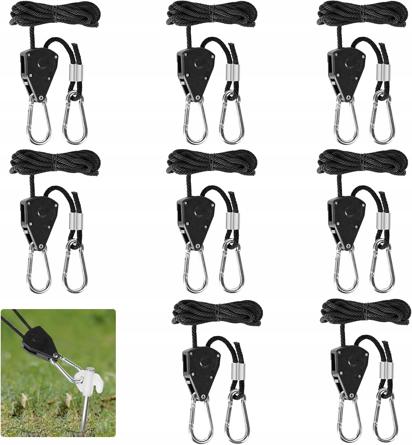 Вы получите 10 веревочных марок, сделанных из тщательно плетеного нейлона с механизмом твердого металла. Веревка длиной 2 м имеет диаметр около 4 мм, а блокировки сжатия алюминия обеспечивают дополнительную безопасность.