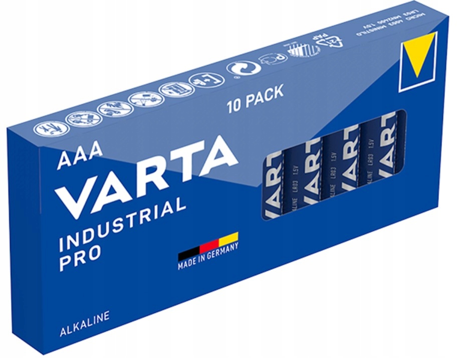 10 щелочных батарей типа AAA LR03 VARTA Industrial PRO (тип 4003), предназначенных для профессионального/промышленного применения.